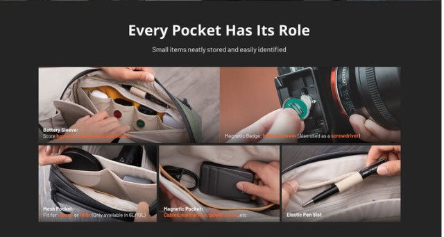 El compartimento trasero especial tiene capacidad para un MacBook de 14" o un iPad Pro de 12,9", mientras que varios bolsillos interiores permiten guardar baterías, cables, filtros, cargadores portátiles, discos duros y otros accesorios técnicos. El compartimento delantero de acceso rápido es ideal para objetos personales, como el teléfono, las llaves o la cartera.