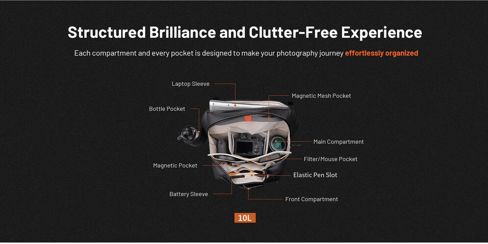 La PGYTECH OneGo Solo Sling Bag V2 (10 l) es una elegante bandolera con protección antirrobo, diseñada para transportar una cámara, hasta tres objetivos y un ordenador portátil o una tableta. Gracias a sus cremalleras YKK, su correa acolchada ajustable, su tejido resistente al agua y su ingeniosa organización interior, es ideal para la fotografía diaria y los viajes.