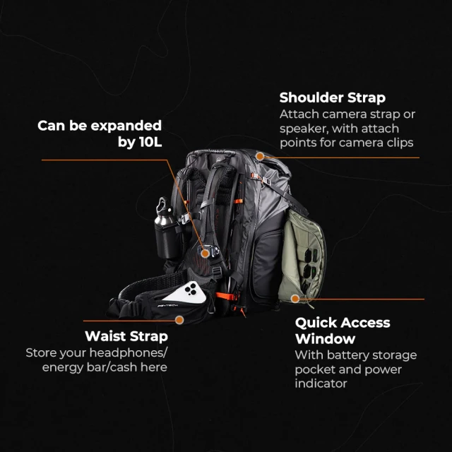 La mochila PGYTECH OnePro Flex Backpack, con una capacidad de 50 litros, te permite guardar tu equipo fotográfico de forma segura y tenerlo siempre a mano. Además, la capacidad se puede ampliar en 10 litros más en la parte superior.
