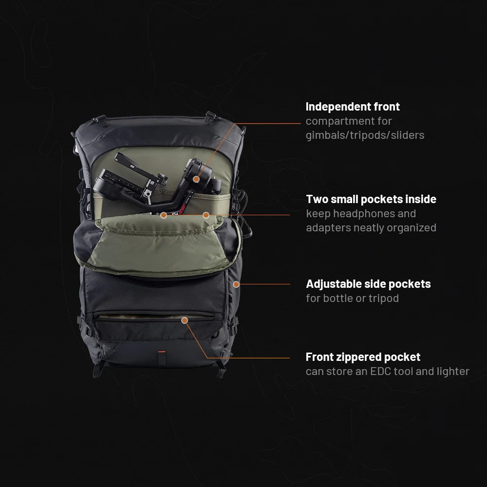 Gracias al compartimento delantero ampliable, al ingenioso sistema de bolsillos y a los puntos de sujeción, podrás guardar fácilmente no solo tu equipo fotográfico, sino también ropa, comida o material de acampada. El compartimento independiente para el portátil y la tableta mantendrá tus dispositivos electrónicos a salvo y bien protegidos.