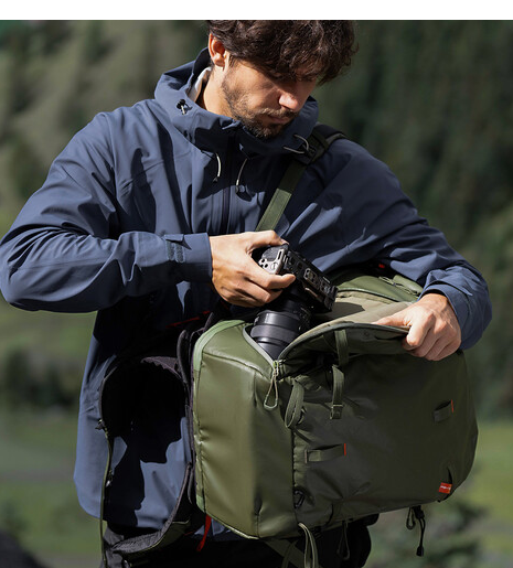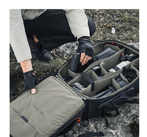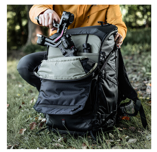 La mochila PGYTECH P-CB-198 OnePro Focux está diseñada para fotógrafos que necesitan una protección fiable para su equipo, combinada con versatilidad para actividades al aire libre. Con una capacidad de 35 litros, la mochila puede albergar hasta dos cámaras réflex o sin espejo, once objetivos y un dron DJI, al tiempo que sigue ofreciendo espacio para objetos personales, como ropa, comida y material de acampada. El compartimento delantero ampliable tiene capacidad para accesorios más grandes, como gimbals o trípodes, y gracias a varios bolsillos y asas, puedes transportar con seguridad bastones de trekking, piolets o una esterilla.