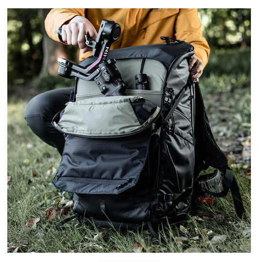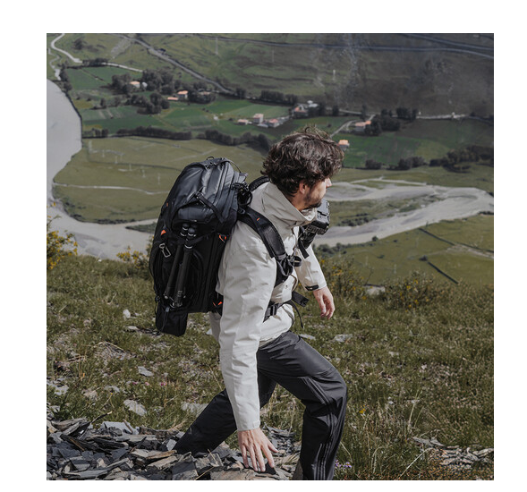 El compartimento delantero ampliable tiene capacidad para gimbals, trípodes o accesorios voluminosos, mientras que varios bolsillos internos y externos permiten guardar el equipo técnico, objetos personales y el equipamiento de exterior imprescindible. Las presillas especiales permiten fijar bastones de trekking, piolets o una esterilla, lo que resulta ideal para viajar, hacer senderismo y trabajar sobre el terreno.