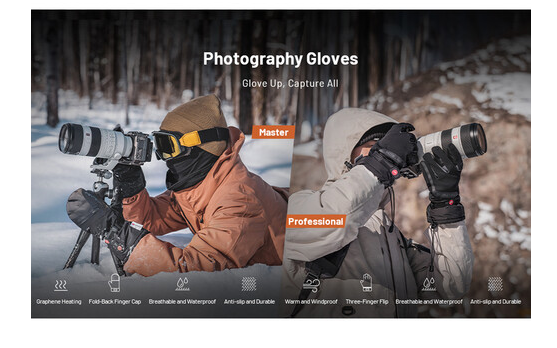 Los guantes combinan algodón 3M Thinsulate, un forro HIPORA impermeable y transpirable, una capa cortavientos y un tejido resistente a las salpicaduras para proteger tus manos del frío, el viento y la humedad. Las palmas acolchadas de cuero y el relleno de SBR mejoran el agarre y la comodidad, mientras que el forro de terciopelo aporta suavidad y aislamiento. Los dedos remangados permiten un fácil acceso para un manejo preciso de la cámara, y la correa para la muñeca con hebilla evita que se pierdan los guantes y los mantiene juntos. Estos guantes son ideales para temperaturas extremas de -31 a 32 °F (-35 a 0 °C) y son el compañero perfecto para la fotografía al aire libre en invierno.
