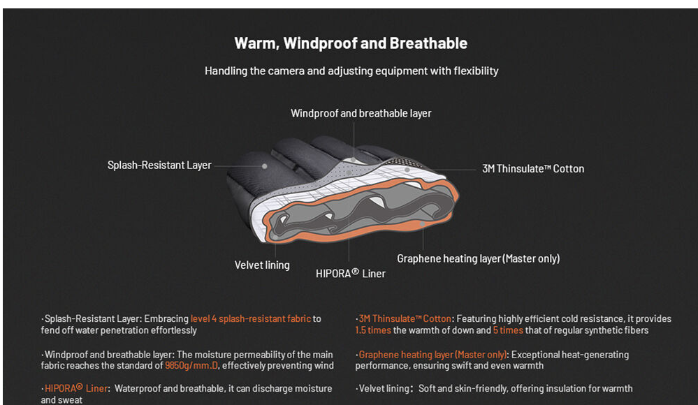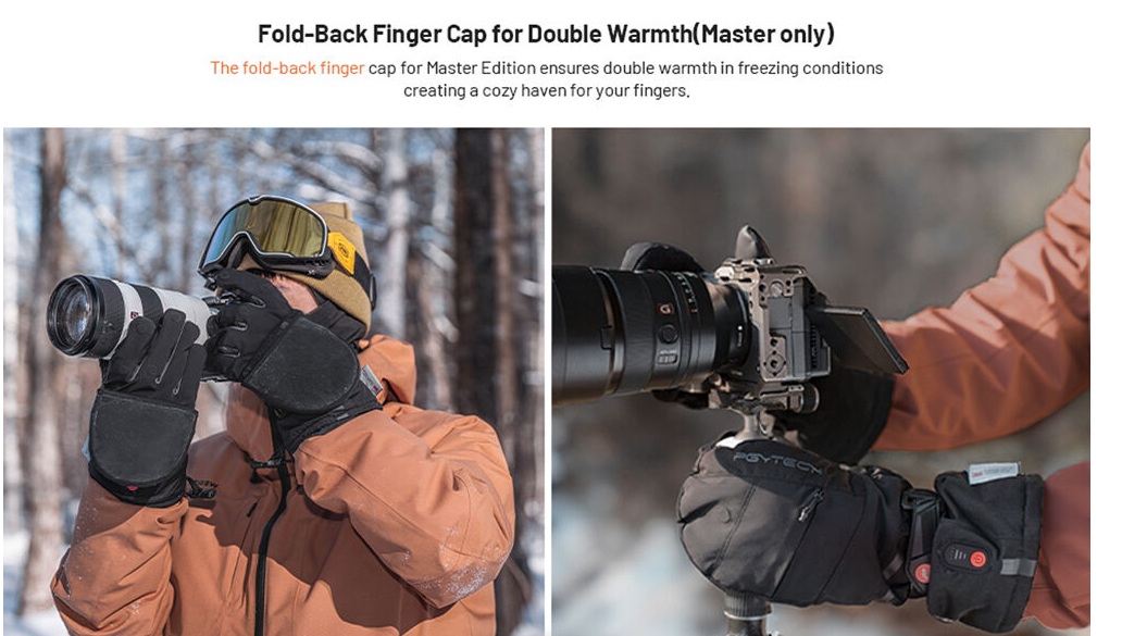 Los guantes PGYTECH P-GM-201 Master Photography Gloves están diseñados para profesionales que fotografían en condiciones invernales adversas. Combinan una tecnología de calefacción avanzada con materiales de primera calidad para proporcionar calor, destreza y protección. El núcleo de los guantes es una capa calefactora de grafeno alimentada por dos baterías tipo C de 4000 mAh, que proporciona un calor rápido y uniforme con tres niveles de temperatura ajustables.