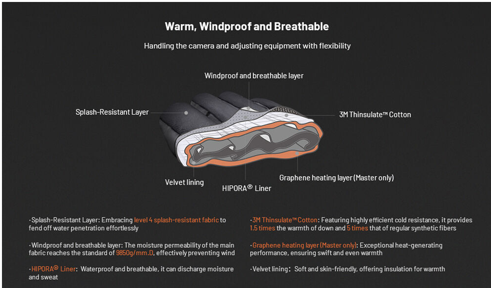 Los guantes PGYTECH P-GM-203 Battery-Heated Master Photography Gloves (talla XL) están diseñados para fotógrafos profesionales que trabajan en condiciones de frío extremo. Estos guantes cuentan con tecnología de calefacción de grafeno y tres ajustes de temperatura, y proporcionan un calor rápido y uniforme. Dos baterías de tipo C con una capacidad de 4000 mAh garantizan una mayor autonomía y pueden servir como cargadores portátiles de emergencia para tus dispositivos. Los guantes están equipados con algodón 3M Thinsulate para una resistencia excepcional al frío, un forro HIPORA impermeable y transpirable, una capa transpirable y resistente al viento, y un tejido resistente a las salpicaduras de agua de nivel 4 que protege contra la humedad. Las palmas de piel auténtica con acolchado SBR ofrecen mayor comodidad, agarre antideslizante y protección para las manos, mientras que el forro aterciopelado garantiza un aislamiento respetuoso con la piel. Las protecciones abatibles para los dedos permiten un manejo preciso y la presilla para la muñeca evita que se pierdan los guantes. Estos guantes son ideales para temperaturas extremas de -31 a 32 °F (-35 a 0 °C) y combinan calidez, resistencia y funcionalidad para la fotografía en exteriores.
