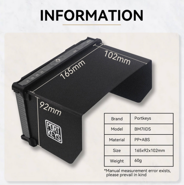 El Portkeys BM7IIDS es un parasol ligero y plegable diseñado específicamente para el monitor BM7 II DS, fabricado en material resistente PP+ABS, con un peso de tan solo 60 g y unas dimensiones de 165 x 92 x 102 mm. Proporciona una reducción eficaz del deslumbramiento en entornos luminosos durante la grabación, al tiempo que mantiene la portabilidad y la facilidad de fijación.