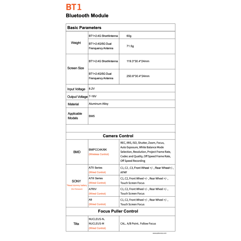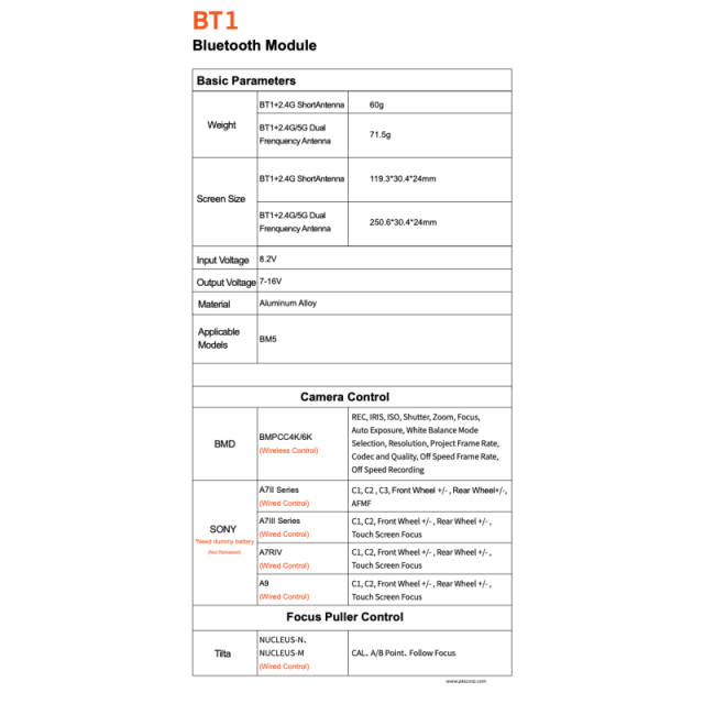 Serie Sony A7II / A7III / A7IV: Control por cable de las cámaras de la serie Sony A7II / A7III / A7IV a través de la conexión BT1 en el BM5. El cable de control con simulador de batería, que estará disponible a finales de mes, debe adquirirse por separado.
