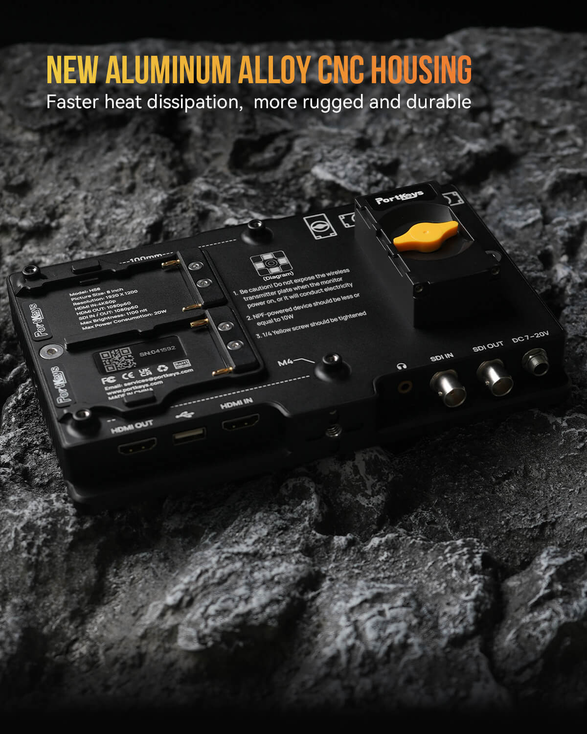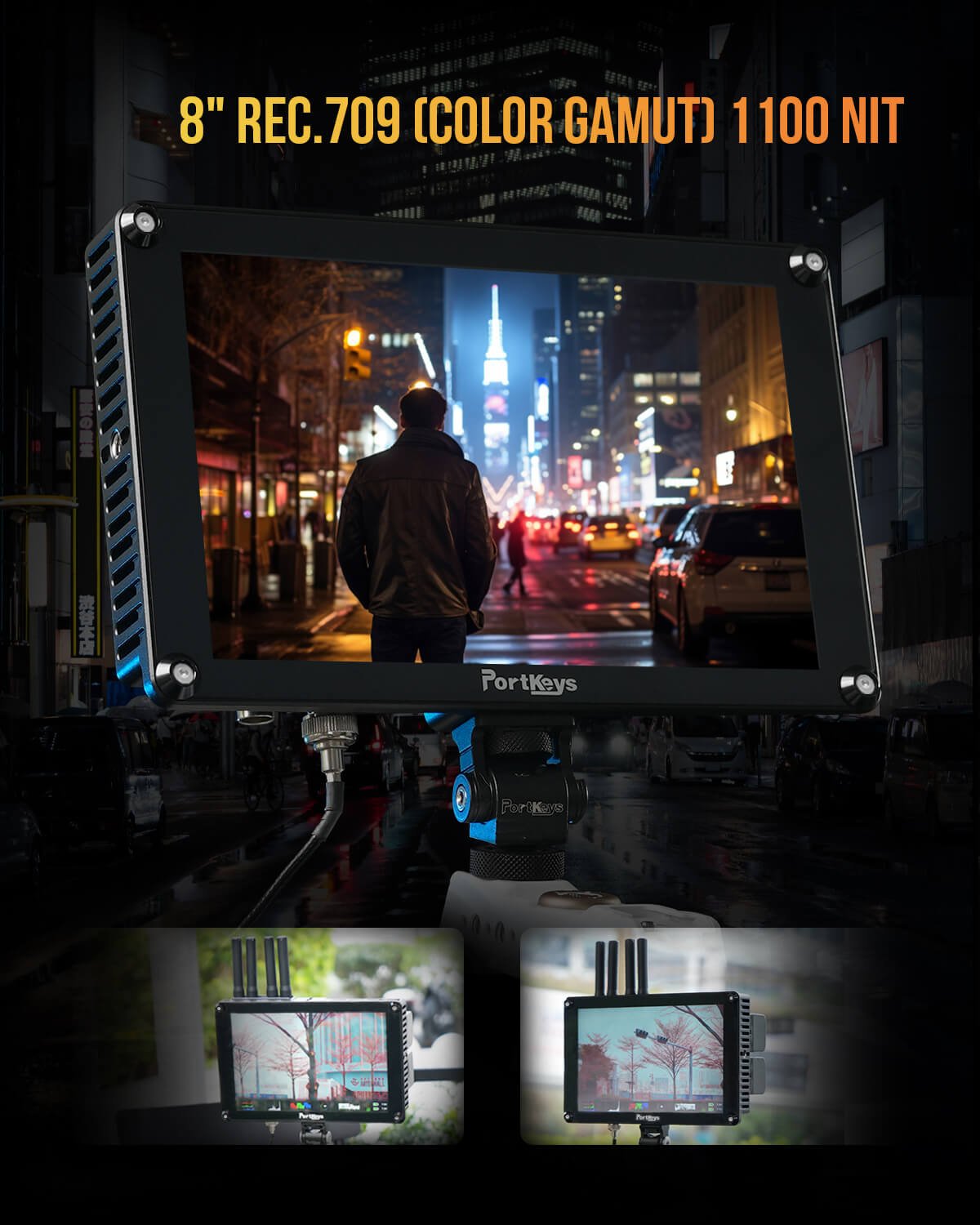 El Portkeys HS8 es un monitor de director de 8 pulgadas con funciones únicas que lo convierten en una novedad revolucionaria para cineastas y profesionales de la producción de vídeo. El monitor HS8 está diseñado para soportar incluso las condiciones de rodaje más exigentes, cuenta con una carcasa resistente totalmente de aluminio y un cristal protectorextraíble y reemplazable delante de la pantalla. Con unas dimensiones de 208 x 133,7 x 50,5 mm y un peso de 675 g, se trata de una unidad de monitorización práctica y compacta que puede compartir con el equipo de cámara, el operador de enfoque, el director o el cliente.