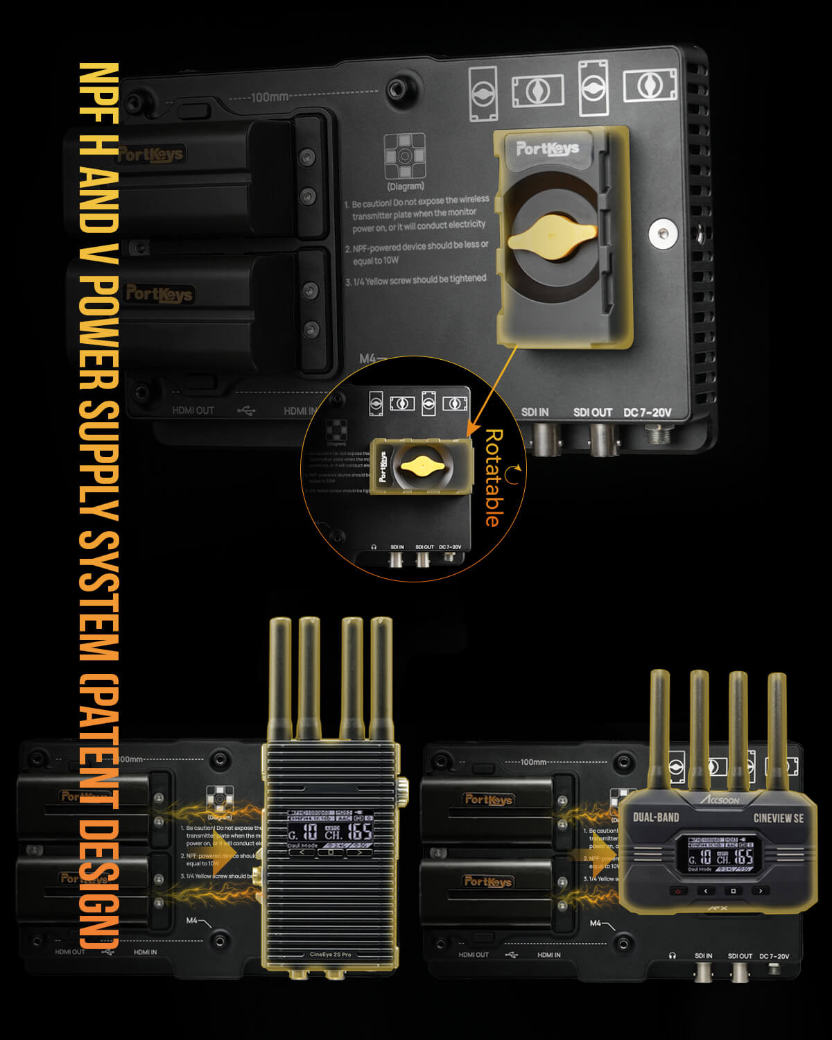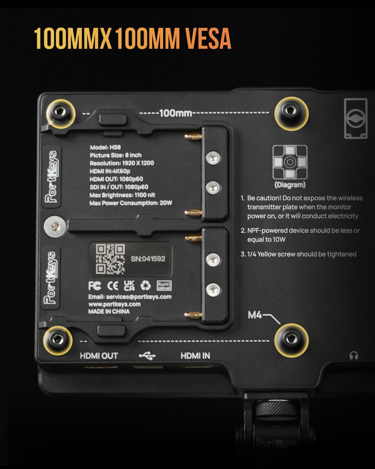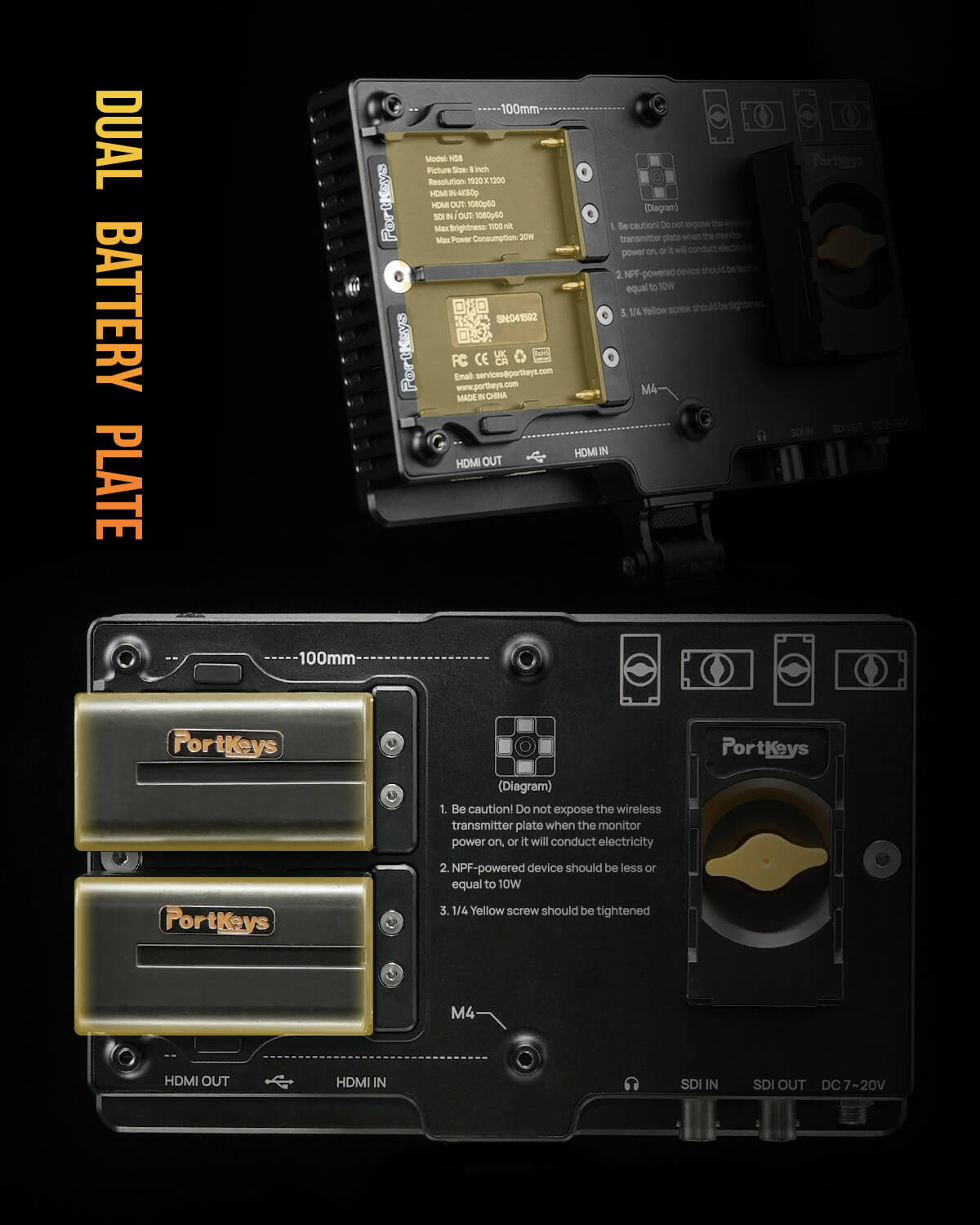 Pero eso no es todo; lo que distingue al monitor HS8 de la competencia y lo hace único es la incorporación de un simulador de batería Sony NP-F extraíble y giratorio con salida de potencia. Esta placa con un simulador de batería Sony NP-F integrado con salida de alimentación (8 V/10 W), patentada por Portkeys, permite conectar y alimentar un receptor de vídeo inalámbrico directamente en la parte trasera del monitor HS8. Este adaptador de alimentación por batería se puede girar 360° sin necesidad de herramientas mediante el gran botón amarillo situado en el centro.