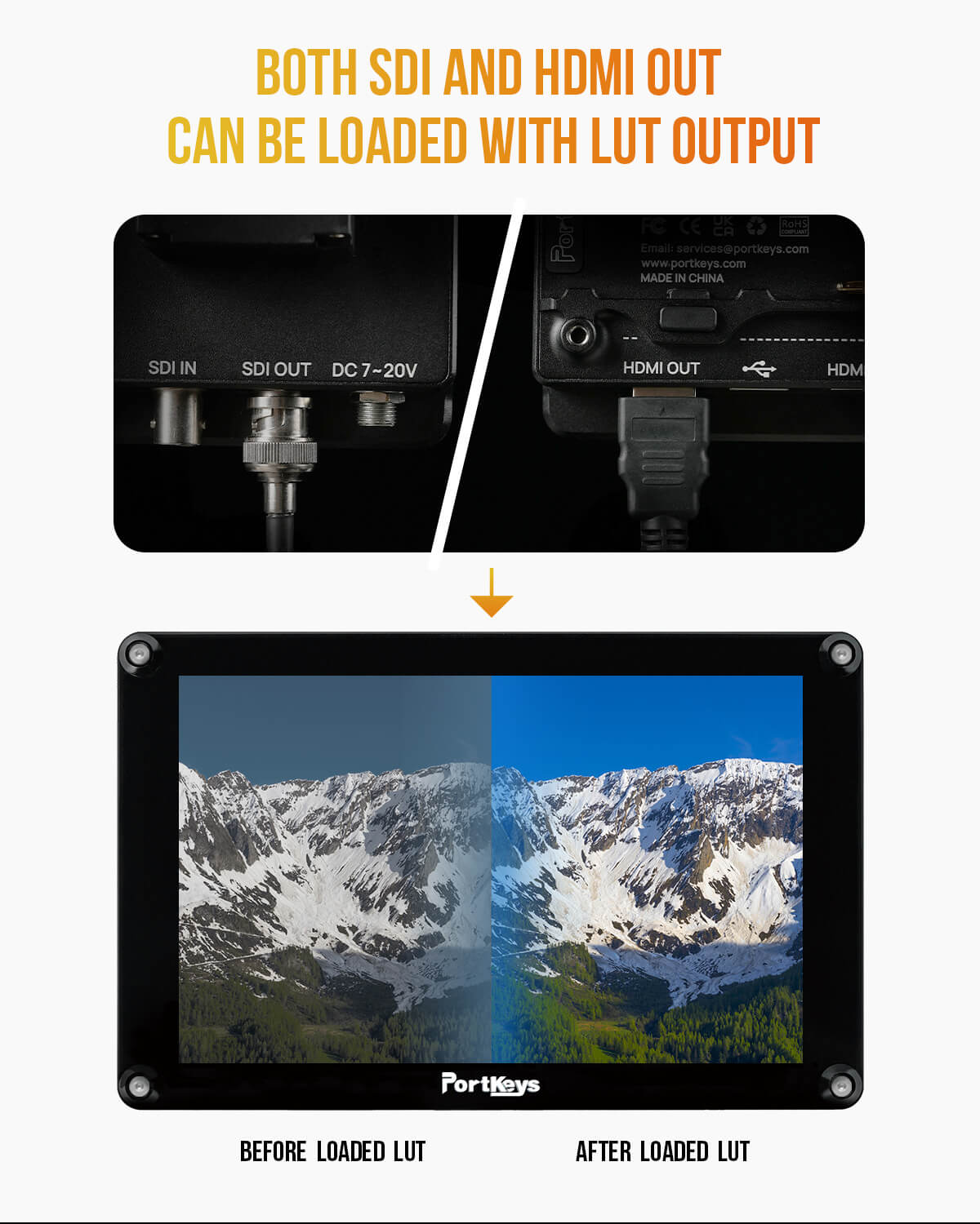 En la parte inferior del monitor encontrarás todos los puertos de entrada/salida de vídeo y alimentación, que están convenientemente empotrados para proteger los conectores y evitar daños accidentales. El Portkeys HS8 es muy versátil y está equipado con todos los puertos de vídeo que se pueden esperar de un monitor profesional, incluyendo un puerto HDMI 4K DCI 60p y un puerto de entrada de vídeo 3G-SDI 1080P60. Además, dispone de un puerto de salida HDMI y un puerto de salida 3G-SDI, ambos compatibles con resoluciones de hasta 1080P60. Es posible la conversión cruzada de la entrada HDMI a la salida SDI y de la entrada SDI a la salida HDMI. Por último, a través de las salidas SDI y HDMI se puede enviar una 3D LUT para mantener la coherencia en toda la cadena de monitorización de vídeo.