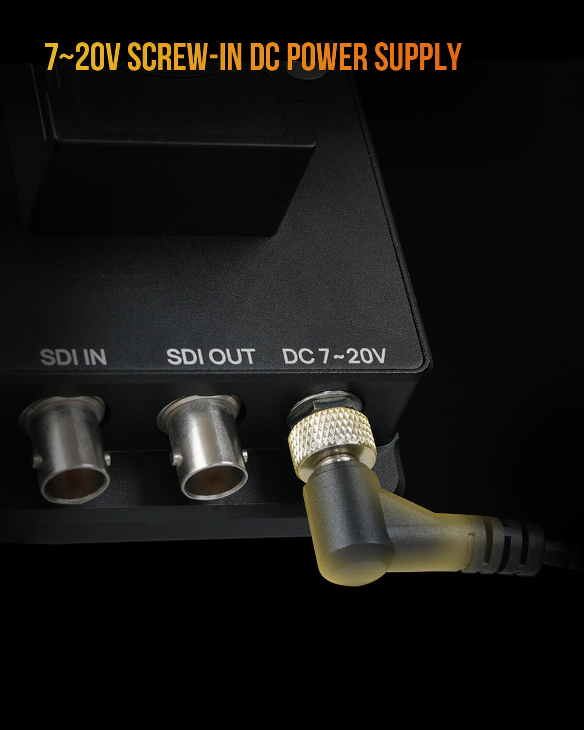 La parte inferior del modelo Portkeys HS8 también está equipada con un conector de 3,5 mm para auriculares y un puerto USB-A para futuras actualizaciones de firmware y la grabación de LUT personalizadas. Además, aquí encontrarás una entrada de alimentación de CC de 7-20 V con un conector cilíndrico de CC de 5,5 × 2,1 mm bloqueable para la alimentación prolongada del monitor mediante una batería V-Mount/Gold Mount y el cable de alimentación D-TAP incluido a un conector de CC atornillable.