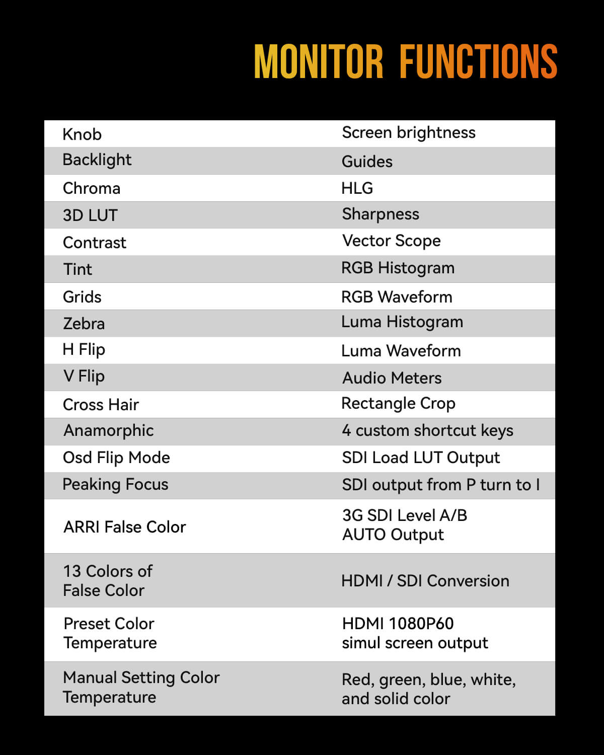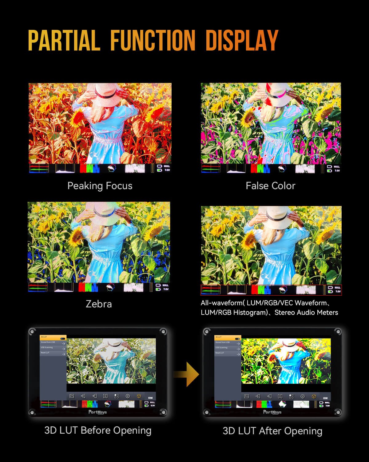 El monitor Portkeys HS8 también le permite tomar decisiones cruciales en el plató y tener confianza en la imagen gracias a un completo conjunto de herramientas de monitorización, entre las que se incluyen, por ejemplo: