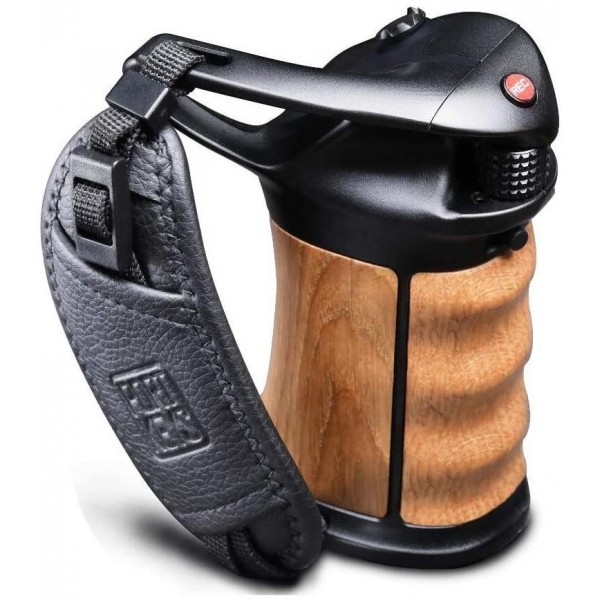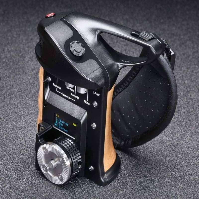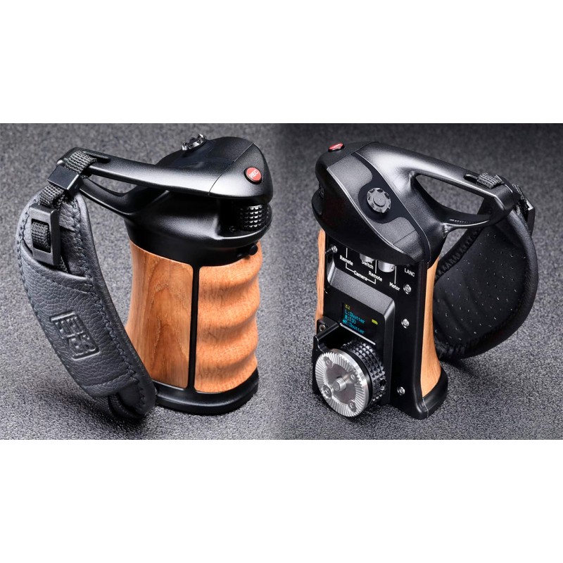 El mando a distancia inteligente para cámaras Keygrip cuenta, entre otras cosas, con un selector para ajustar rápidamente la sensibilidad ISO, la velocidad de obturación y la apertura (en la parte delantera del mango), así como con un joystick de 9 posiciones para navegar fácilmente por el menú de la cámara controlada. Gracias a las interfaces Bluetooth y Wi-Fi, se puede controlar una amplia gama de cámaras de forma inalámbrica (por ejemplo, la Blackmagic Pocket Cinema Camera 4K/6K), o bien utilizar alguno de los cables opcionales (LANC, etc.) para cámaras sin compatibilidad con BT/Wi-Fi. El cuerpo del controlador está fabricado en una resistente aleación de aluminio y el mango en madera de roble para ofrecer la máxima resistencia y comodidad. También cuenta con una pantalla OLED de 0,9" de excelente legibilidad, indicador del estado de las baterías (2x 18650; incluido en el suministro junto con el cargador), roseta para fijar el controlador a las cámaras, etc.