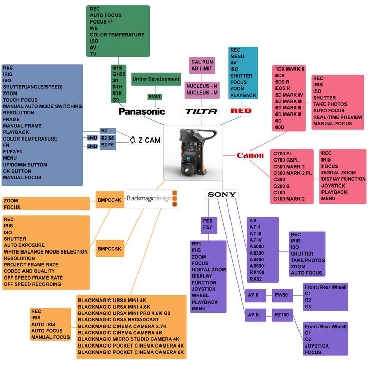 . Control por cable (disparador de grabación y fotografía, apertura, ISO, obturador, zoom, AF) en los modelos A9, A6000, A6300, A6400, A6500, RX100, RX02. También compatible con los modelos Sony A7II, A7III y A7iV (requiere un accesorio de alimentación opcional). En los modelos Sony FS5 y FS7 se puede controlar (por cable) el disparador de grabación, la apertura, el zoom, el enfoque, el zoom digital, las funciones del joystick/pantalla y la reproducción.
