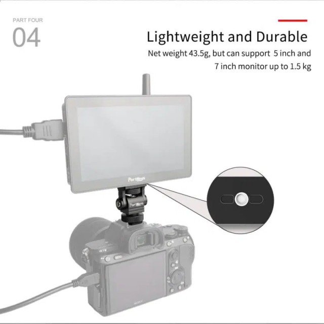 Peso neto de 43,5 g, pero soporta monitores de 5 y 7 pulgadas de hasta 1,5 kg (carga útil máxima: 3 libras y 4,9109 onzas)