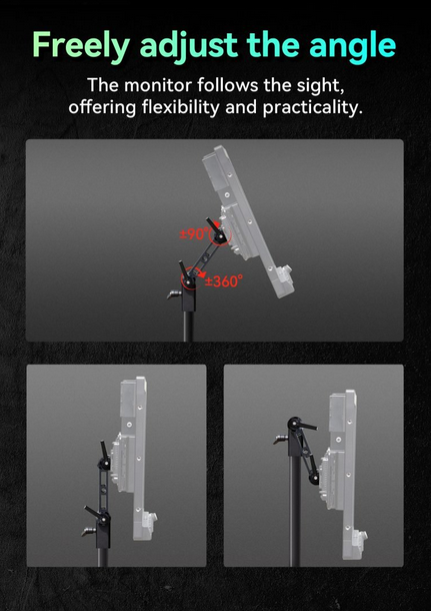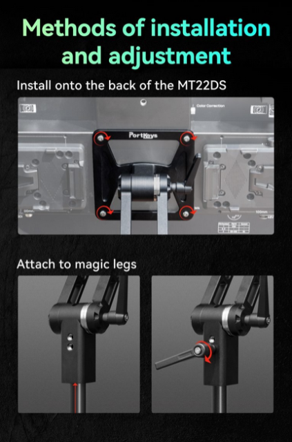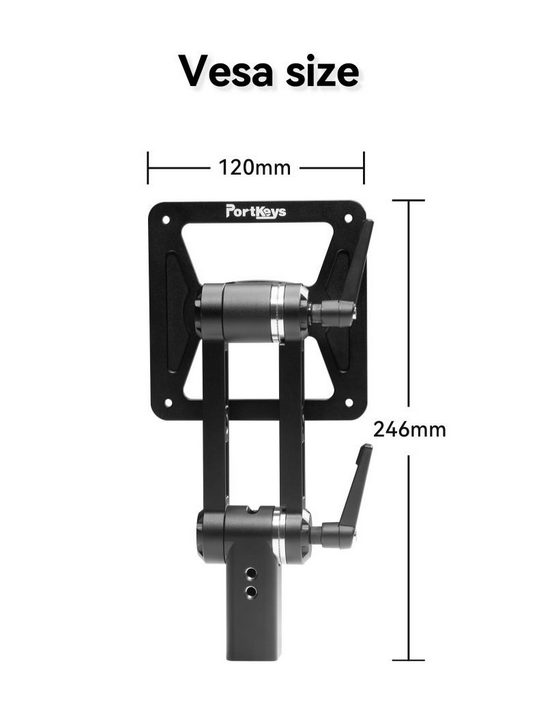 El soporte Portkeys MT22DS VESA es un soporte de montaje universal diseñado para el monitor MT22DS, que ofrece una inclinación de ±90° y un giro de ±360° para un ajuste flexible del ángulo, una instalación sencilla directamente en la parte trasera del monitor o mediante patas magnéticas, y un tamaño compatible con VESA de 120 mm x 246 mm.