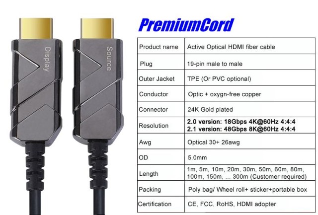 PremiumCord kphdm21x20 Cable óptico HDMI 2.1 AOC de ultra alta velocidad, 8K a 60 Hz, con contactos dorados