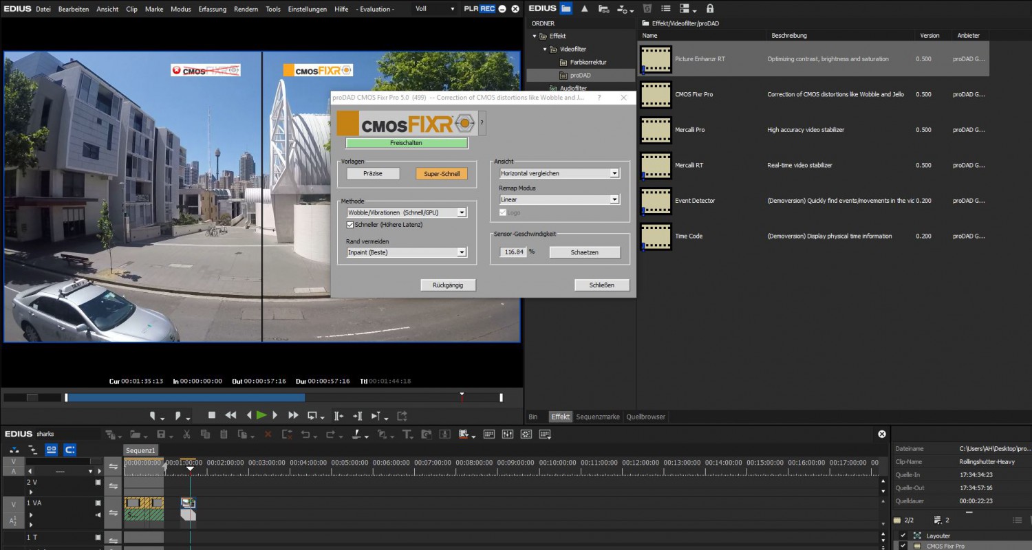 Con la nueva versión del programa/complemento de estabilización ProDAD Mercalli, ya no es necesario el tedioso proceso de análisis de imagen. El nuevo complemento Mercalli RT funciona en tiempo real y permite ajustar el grado de estabilización y recortar o ampliar la imagen. También es nuevo el complemento Picture Enhanzr, que permite ajustar de forma automática (y manual) el color, el contraste y el brillo de la imagen. Para reducir la distorsión extrema de la imagen causada por la lectura por líneas de los sensores de imagen (rolling shutter) se utiliza la herramienta CMOS FIXR Pro. Los complementos ofrecen aceleración mediante GPU y multithreading (hasta 256 núcleos) y son compatibles con la resolución 4K.