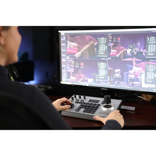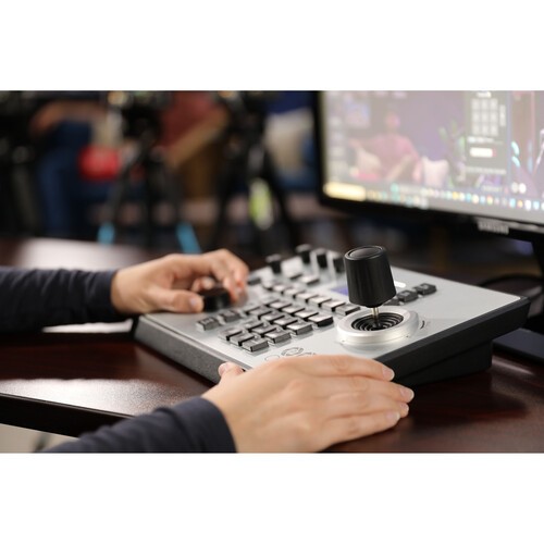 El controlador PT-JOY-G4 con joystick permite un control intuitivo de hasta 255 cámaras en tiempo real a través de IP o de hasta siete cámaras a través de una interfaz serie, y es compatible con los protocolos VISCA, VISCA-over-IP, Pelco-P, Pelco-D y ONVIF. Ofrece un ajuste preciso del giro, la inclinación, el zoom, la apertura y el enfoque, junto con el balance de blancos y el control de la exposición, además de nueve preselecciones para cambiar rápidamente. Los botones retroiluminados del controlador, la pantalla LCD y la compatibilidad con PoE lo hacen ideal para entornos con poca luz o entornos de producción complejos. En conjunto, este paquete representa una solución flexible y fácil de usar para la retransmisión y el streaming desde múltiples cámaras.