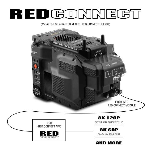 El módulo RED Connect se conecta a las cámaras V-RAPTOR o V-RAPTOR XL (V-Lock) y permite la transmisión en directo de vídeo 8K a través del servicio RED Connect. RED Connect permite a los usuarios transmitir archivos RAW R3D directamente desde los sistemas de cámaras V-RAPTOR y V-RAPTOR XL a través de IP a la unidad de control de cámara (CCU) en tiempo real, lo que abre un extraordinario abanico de aplicaciones creativas, desde la retransmisión en directo hasta la producción virtual y la producción real en 8K VR.