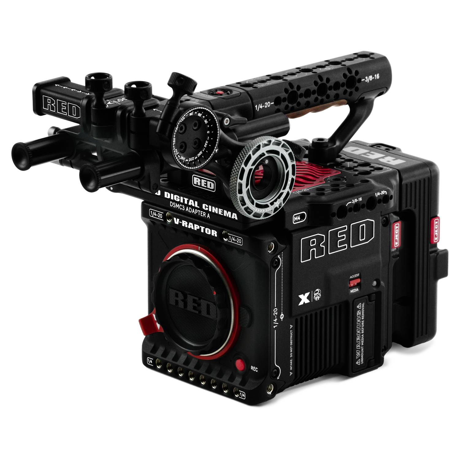 Notas: La abrazadera de 15 mm no está incluida en el suministro; se puede utilizar, por ejemplo, el soporte superior RED de 15 mm y el soporte de varilla LWS superior V-RAPTOR XL de 15 mm para el sistema DSMC3. El visor electrónico compacto RED y el adaptador DSMC3 A se venden por separado.
