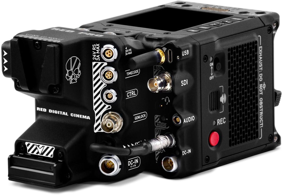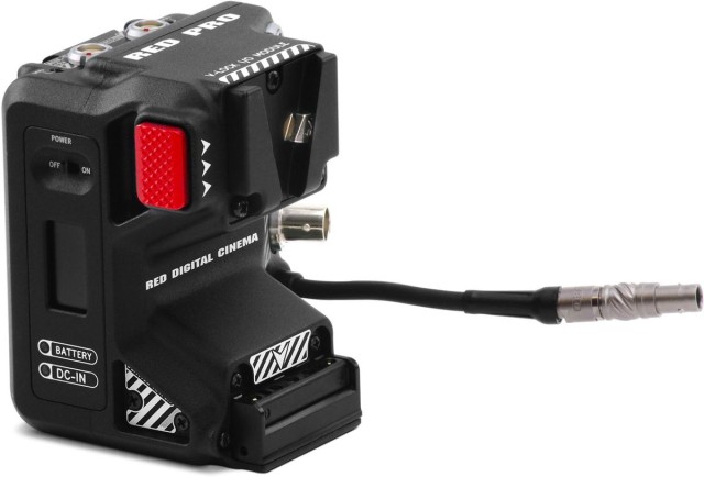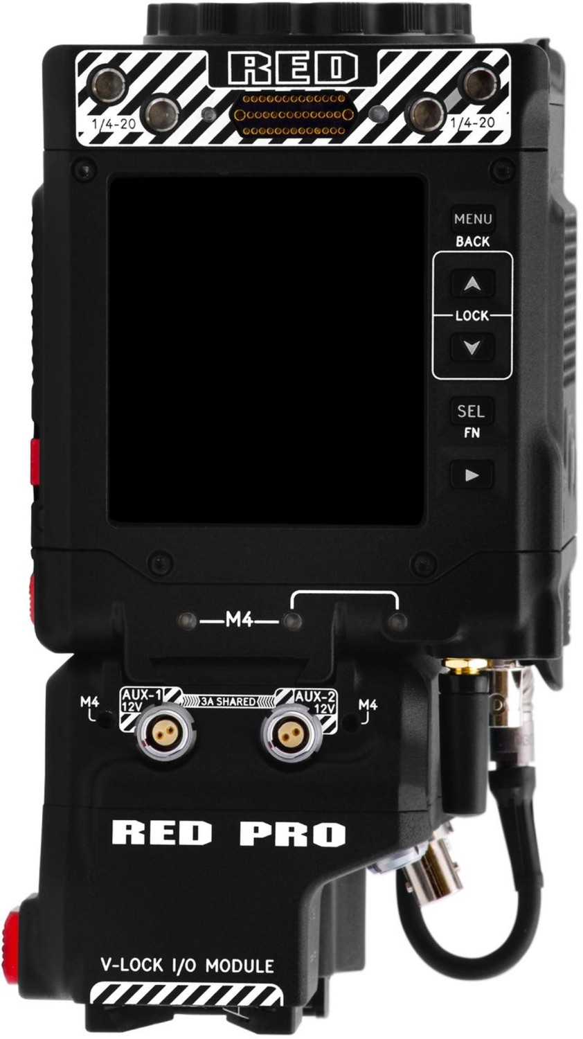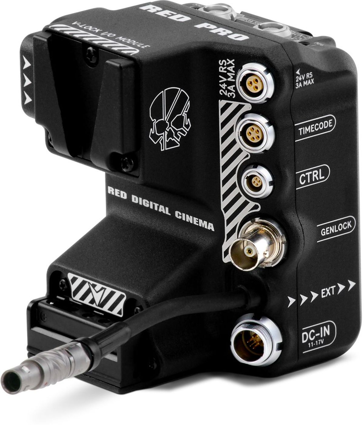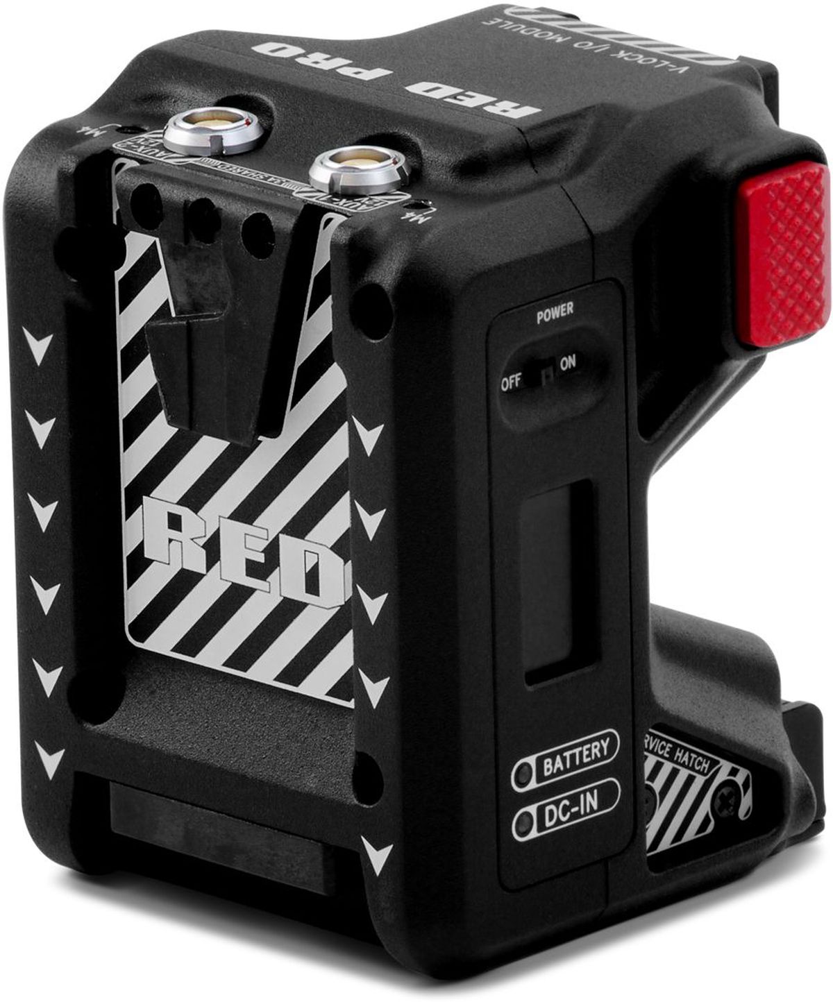 El módulo adicional RED Pro I/O V-Lock Module amplía las entradas y salidas de las cámaras RED Komodo-X y RED V-Raptor, además de añadirles compatibilidad con baterías estándar de tipo V-Mount. El módulo se conecta directamente a la placa Micro V-Lock situada en la parte trasera de la cámara y al puerto Ext Port de 9 pines, y ofrece lo siguiente: