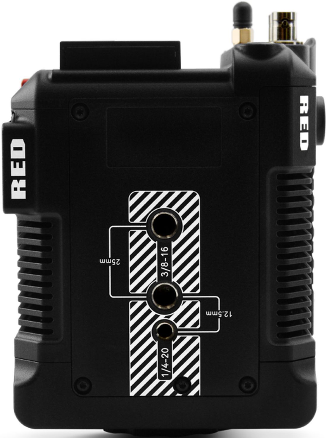 • Control remoto: antena Wi-Fi (2,4 GHz/5 GHz), interfaz RP-SMA. Genlock, entrada de código de tiempo, GPIO y RS-232 (puerto EXT integrado de 9 pines). Control remoto a través de USB-C o Gigabit Ethernet (requiere un adaptador USB-C a Ethernet opcional) que permite el control remoto, la vista previa M-JPEG y la descarga de archivos multimedia.
