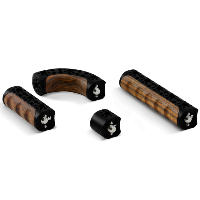 La empuñadura superior V-RAPTOR™ está equipada con un botón especial de arranque/parada, inserciones ergonómicas de madera de bocote y varios puntos de fijación de 3/8-16 y 1/4-20. Además, incluye prolongadores de 1", 3" y 5" para la empuñadura superior, una pieza en forma de codo y un soporte para monitor de 15 mm.