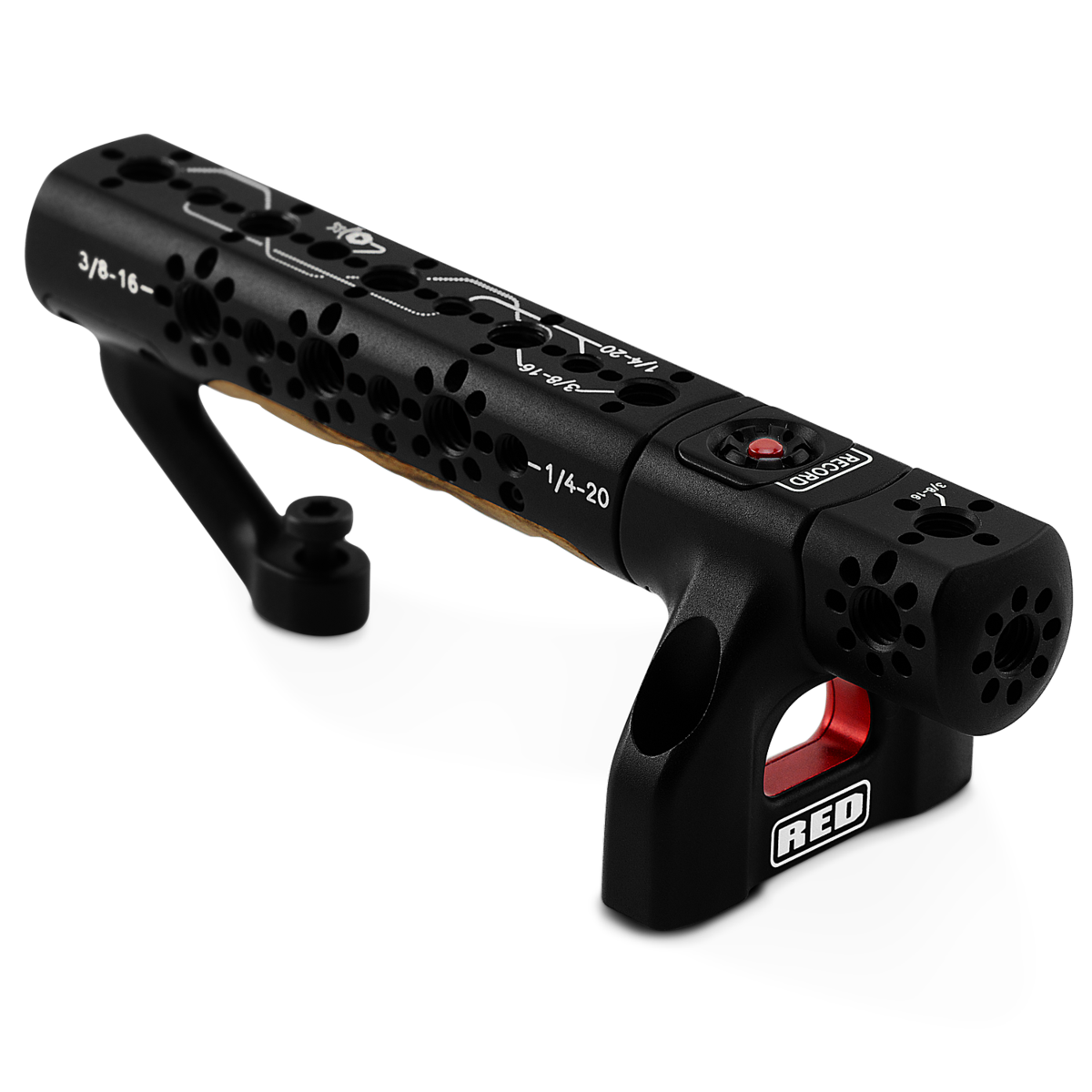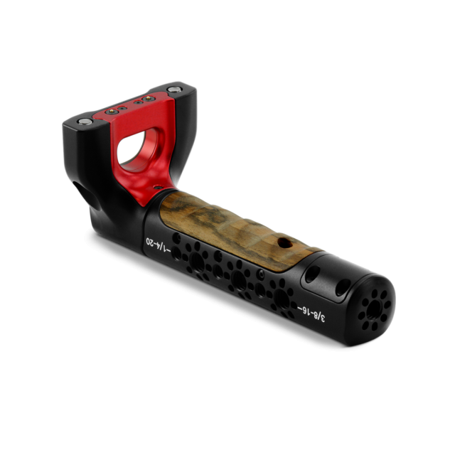 La empuñadura superior V-RAPTOR™ está equipada con un botón especial de arranque/parada, inserciones ergonómicas de madera de bocote y varios puntos de fijación de 3/8-16 y 1/4-20. Además, incluye prolongadores de 1", 3" y 5" para la empuñadura superior, una pieza en forma de codo y un soporte para monitor de 15 mm.