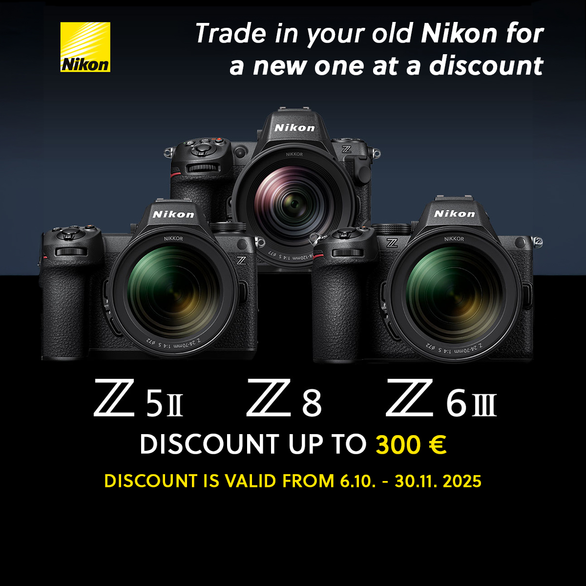 Desdeel lunes 6 de octubre de 2025hastael domingo 30 de noviembre de 2025, se celebra la promoción especialTRADE IN / CAMBIA LO VIEJO POR LO NUEVOen una selección de cámaras Nikon.