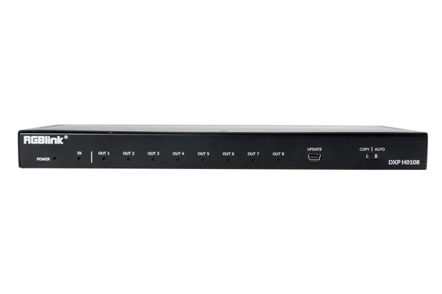 El RGBlink DXP H0108 es un distribuidor de vídeo HDMI 2.0 profesional que recibe una entrada HDMI y la distribuye simultáneamente a ocho salidas HDMI. Admite resoluciones de hasta 4096×2160 a 60 Hz, es compatible con HDR y HDCP 2.2, y garantiza una distribución de la señal de alta calidad sin pérdida de calidad para aplicaciones audiovisuales exigentes.