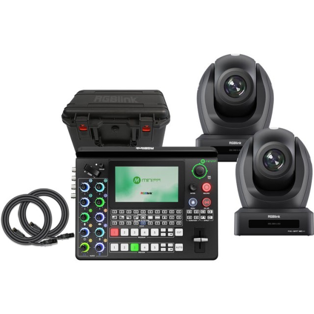 El RGBlink mini-edge SDI con el paquete 2 vue 4K 20X PTZ es una solución portátil completa para la producción en directo que combina un conmutador de vídeo profesional de 10 canales con dos cámaras PTZ compatibles con IA. Este paquete, diseñado para retransmisiones, streaming, formación y eventos, ofrece una potente conmutación HDMI/SDI, control PTZ, streaming en múltiples plataformas y grabación de vídeo con calidad de estudio en un sistema resistente con carcasa rígida.