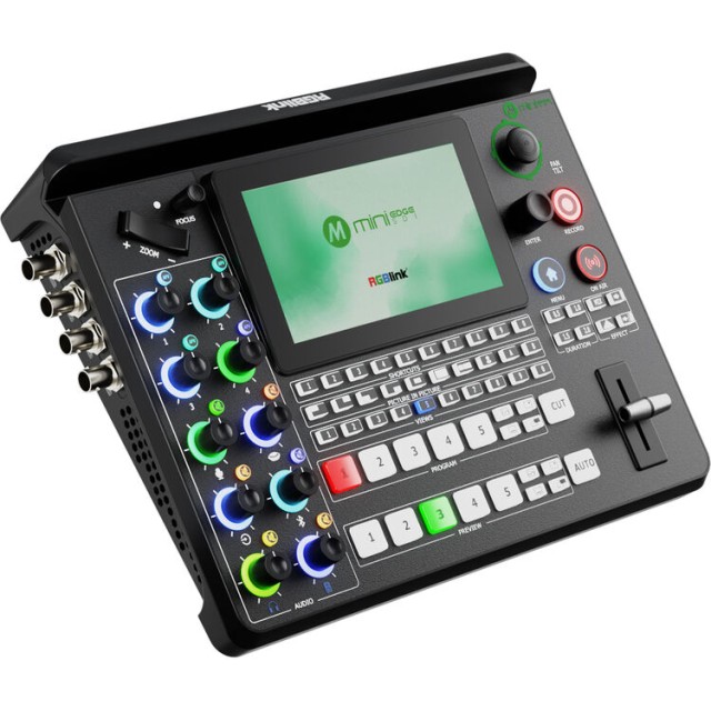 El Mini-edge SDI está equipado con una pantalla HD en color de 5,5" integrada para monitorizar entradas, vistas previas y salidas de programas en tiempo real. Su panel de control táctil incluye botones retroiluminados, mandos, joystick y fader T-bar para una conmutación rápida y precisa. El control PTZ integrado a través de VISCA y NDI|HX3 permite controlar directamente el giro, la inclinación, el zoom y el enfoque de hasta cuatro cámaras directamente desde el mezclador, con control mediante joystick y activación de valores preestablecidos.