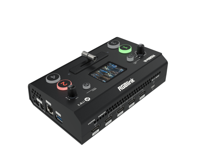 El conmutador de producción en directo RGBlink mini 2022 combina conmutación, monitorización, mezcla de audio y transmisión en una sola unidad compacta. Cuenta con cuatro entradas HDMI 1.3 y una salida HDMI, y admite 6 imágenes en multiview, lo que permite a los operadores alternar rápidamente entre la vista previa y las salidas de programa para una conmutación en directo fiable. La pantalla TFT a todo color integrada de 2,1 pulgadas ofrece monitorización de señal en tiempo real y una navegación intuitiva por los menús.