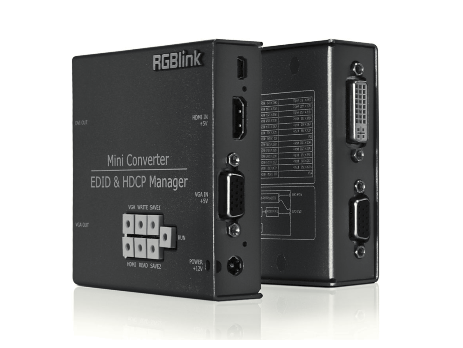 El RGBlink MSP 221 es una herramienta universal para la gestión de EDID y HDCP, ideal para integradores audiovisuales, equipos de producción de vídeo y aplicaciones de señalización digital. Gracias a sus entradas HDMI y VGA y a sus salidas DVI y VGA, permite el enrutamiento fluido de la señal entre dispositivos, manteniendo al mismo tiempo la comunicación correcta con la pantalla. El dispositivo identifica automáticamente la configuración EDID, admite la lectura de archivos EDID desde USB y permite copiar o escribir configuraciones directamente desde el panel frontal o a través de la interfaz USB.