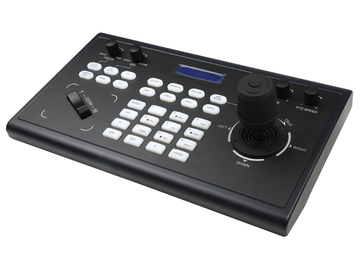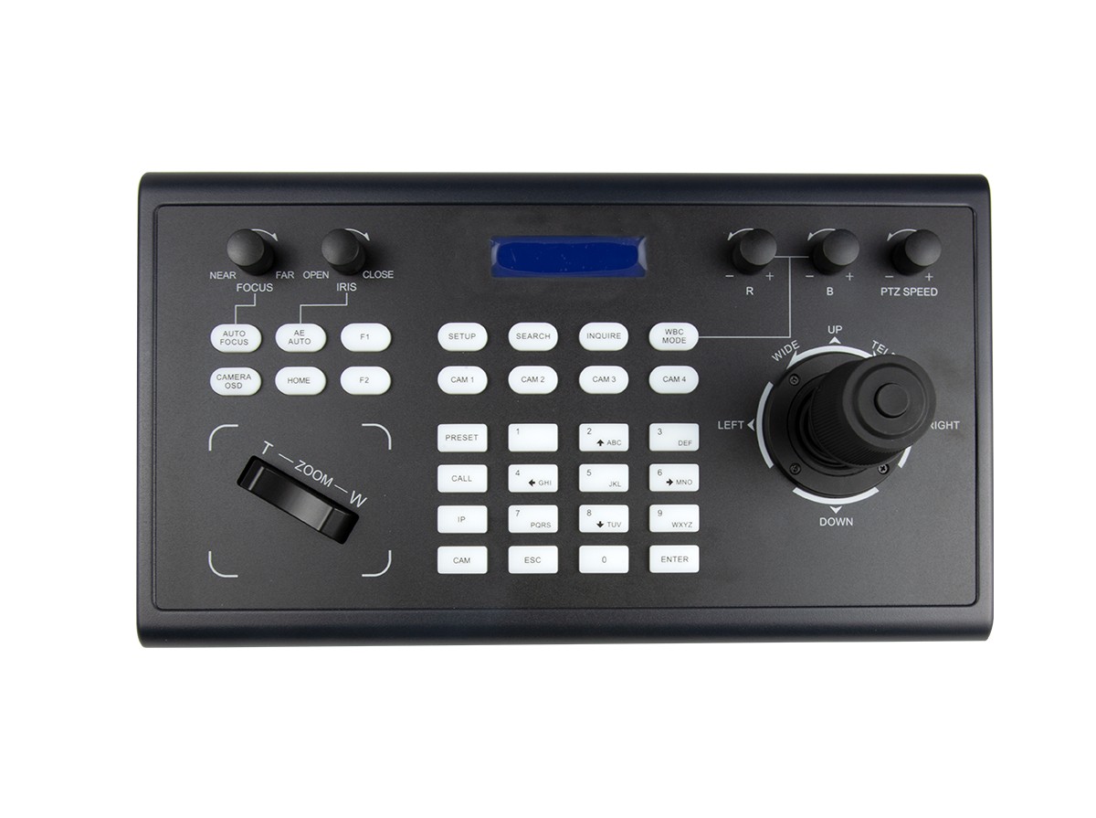 El controlador de cámaras PTZ RGBlink permite controlar hasta 255 cámaras a través de conexiones Ethernet y serie. Es compatible con los protocolos ONVIF, VISCA, Pelco-D y Pelco-P. El joystick, los botones giratorios y los controles del teclado permiten al usuario cambiar rápidamente entre cámaras PTZ y ajustar los parámetros. En el panel frontal hay una pantalla LCD con respuesta sonora de las teclas.