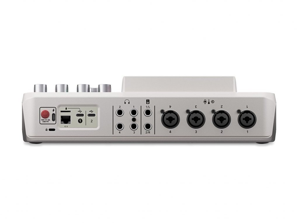 Estudio de producción de podcasts, 4 entradas combinadas XLR/TRS, TRRS (conector jack pequeño), Bluetooth, Wi-Fi, doble puerto USB-C, ranura microSD, procesamiento Aphex en las entradas, distribuidor de auriculares, color blanco