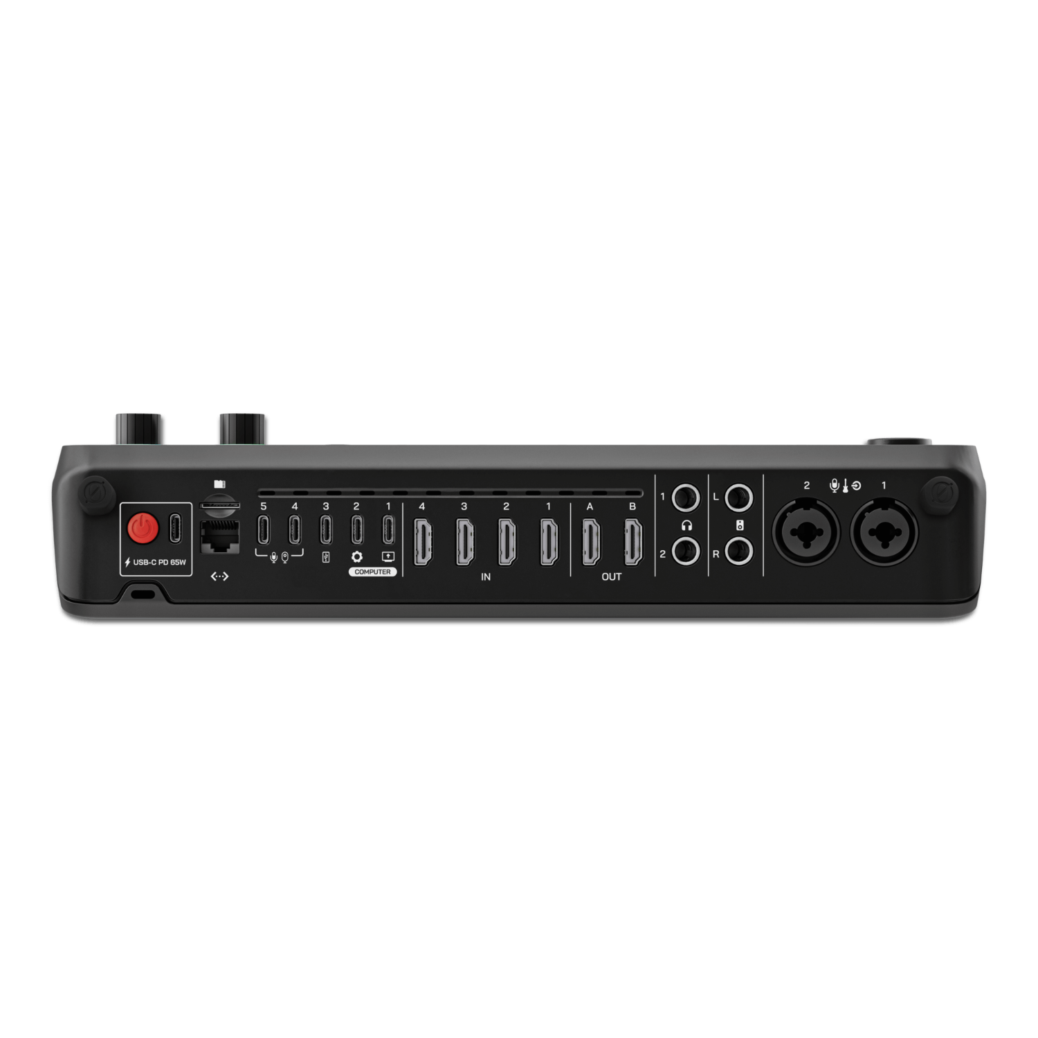 El corazón de la consola RØDECaster Video es un procesador de ocho núcleos de alto rendimiento que garantiza el funcionamiento fluido de todas sus funciones. Cuenta con cuatro entradas HDMI en resolución Full HD (1080p) con conversión automática de frecuencia de fotogramas, así como dos salidas HDMI configurables para la visualización del programa, la vista previa y el multiview. La consola también incluye dos puertos USB-C flexibles para conectar cámaras web compatibles y dispositivos de audio USB de RØDE, lo que amplía tus opciones de fuentes de vídeo y audio.