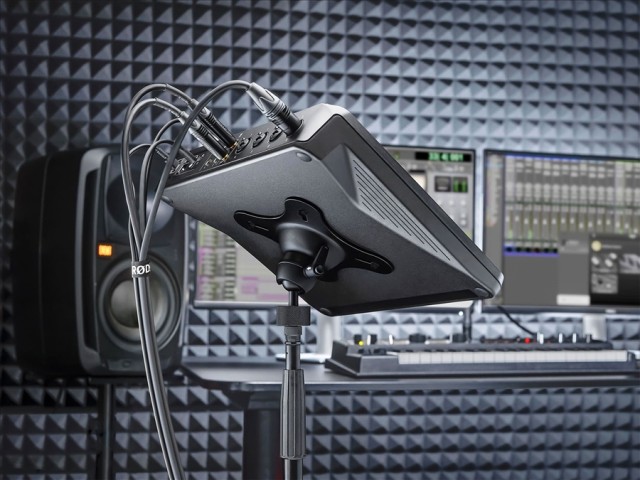 El soporte se acopla a cualquier pie de micrófono estándar. De este modo, constituye la forma perfecta de colocar el dispositivo en diferentes posiciones.