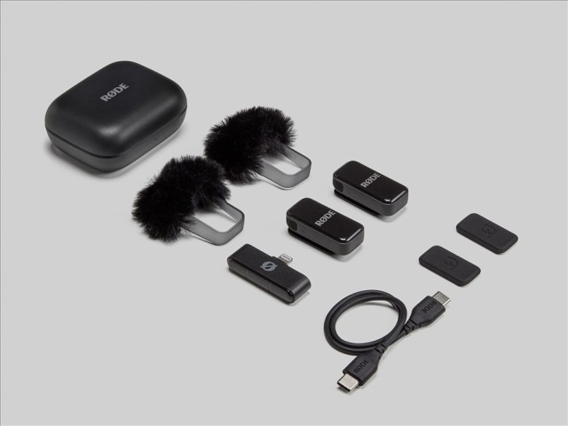 e viene con todo lo necesario para grabar audio decalidad profesional de forma inalámbrica: dos transmisores con micrófonos integrados, un receptor, un estuche de carga inteligente, protectores contra el viento, imanes para fijarlo a la ropa y un cable de alimentación USB-C.