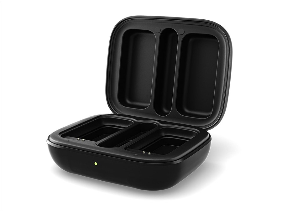 es un estuche de transporte protector para ambos transmisores y el receptor. Al mismo tiempo, funciona comobase de recarga que garantiza la recarga de los transmisores durante el transporte o las pausas de grabación. Se puede alimentar mediante el cable USB-C incluido, o bien puede utilizarla batería interna, que permite realizardos recargas completasde todos los componentes del kit.
