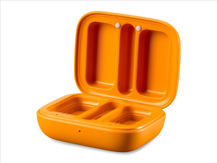 es un estuche de transporte protector para ambos transmisores y el receptor. Al mismo tiempo, funciona comobase de recarga que garantiza la recarga de los transmisores durante el transporte o las pausas de grabación. Se puede alimentar mediante el cable USB-C incluido, o bien puede utilizarla batería interna, que permite realizardos recargas completasde todos los componentes del kit.