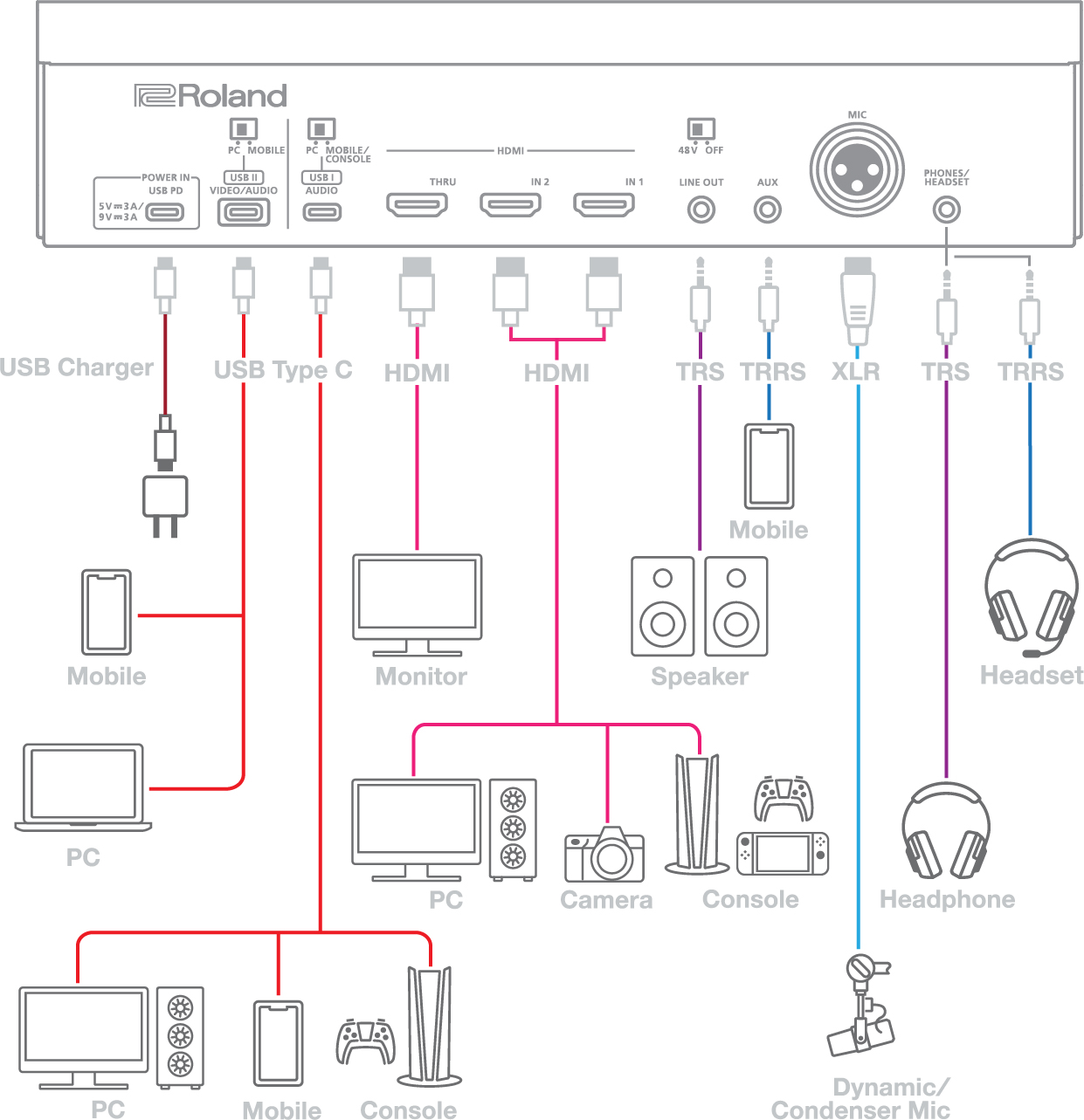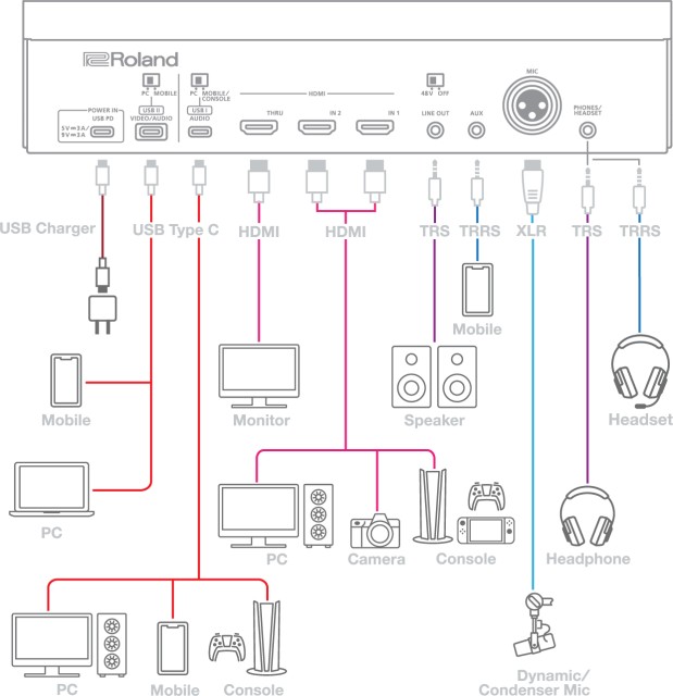 Con Bridge Cast X, puedes centrarte en crear —desde juegos online hasta podcasts, vlogs y otro contenido de vídeo— sin preocuparte por los cables y los diversos accesorios especializados. Su diseño integrado simplifica la conexión y reduce el desorden de cables, mientras que su interfaz intuitiva te permite mezclar el sonido de forma fluida y controlar todas las funciones necesarias. Gracias a varios puertos USB-C y HDMI (solo puede estar activa una entrada HDMI a la vez; no se admite el cambio en directo entre entradas HDMI), puedes conectar todos tus dispositivos y evitar tener que reconectar todo manualmente cada vez que quieras cambiar la configuración para una retransmisión programada.