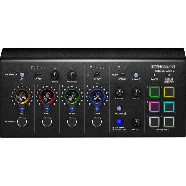 Mejora tus retransmisiones con Bridge Cast X, una solución de sobremesa compacta «todo en uno» con controles prácticos y funciones audiovisuales profesionales de Roland. Despídete del desorden de pequeños accesorios y unifica tu flujo de trabajo mediante varias conexiones para consolas de videojuegos, ordenadores, cámaras y dispositivos de audio. Arrasa con la competencia gracias a excelentes funciones como mezclas de audio duales, compatibilidad con micrófonos profesionales (XLR, alimentación fantasma), procesamiento de efectos vocales, control ergonómico mediante pads y otras funciones...