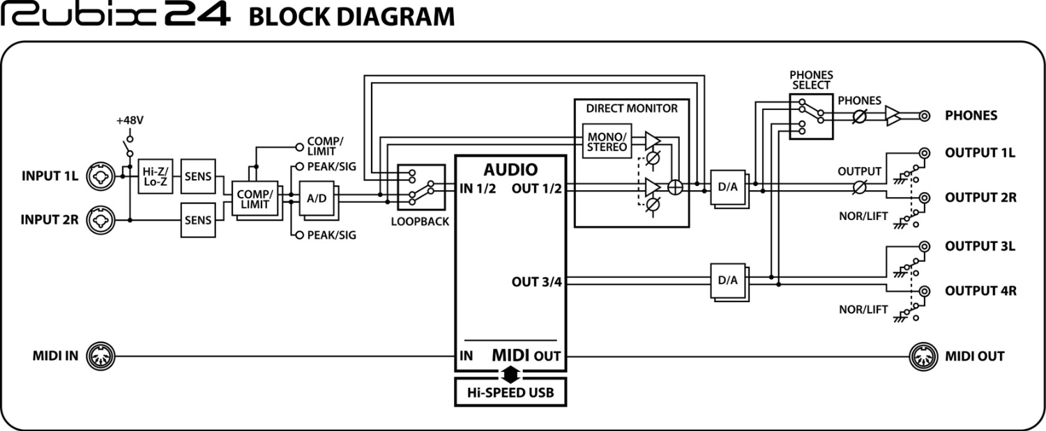 SENS 1L/2R, Hi-Z, 48 V, THRS, COMP/LIMIT, DIRECT MONITOR, MONO, OUTPUT, PHONES, POWER SOURCE, LOOPBACK, COMP/LIMIT TYPE, GROUND LIFT, PHONES SOURCE