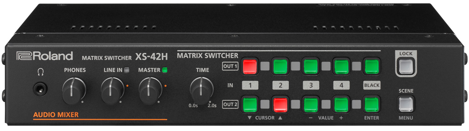 Aunque la mayoría de los paneles LED y LCD de televisión tienen un buen aspecto, el sonido suele quedar en un segundo plano. El Roland XS-42H incluye salidas RCA estéreo para conectarse a altavoces externos o barras de sonido, lo que garantiza una calidad de sonido notablemente mejor. El mezclador de audio interno del modelo XS-42H conmuta el sonido para que coincida con la entrada de vídeo, utilizando el audio integrado en la señal HDMI del ordenador; no se necesitan cables de audio adicionales.