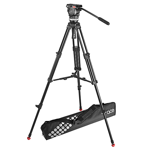 Sachtler System Ace M en aluminio con cabezal fluido, trípode Ace 75/2 D, barra central y bolsa de transporte.