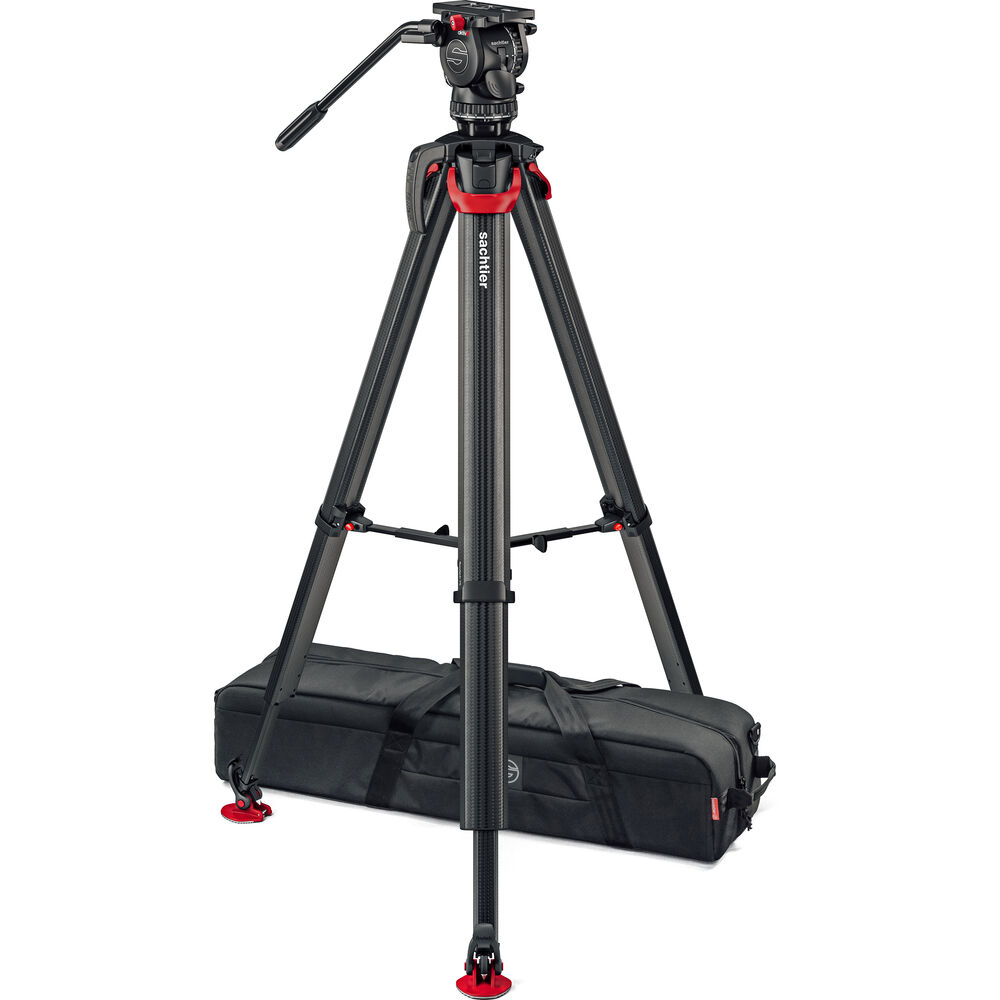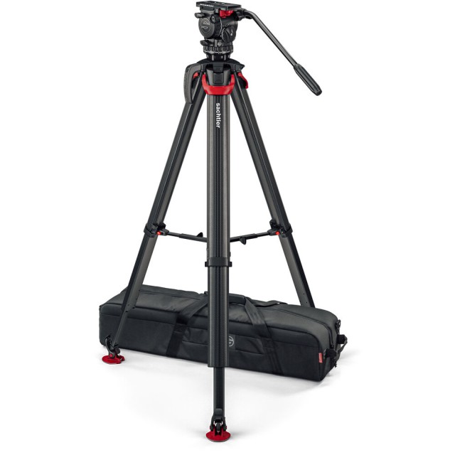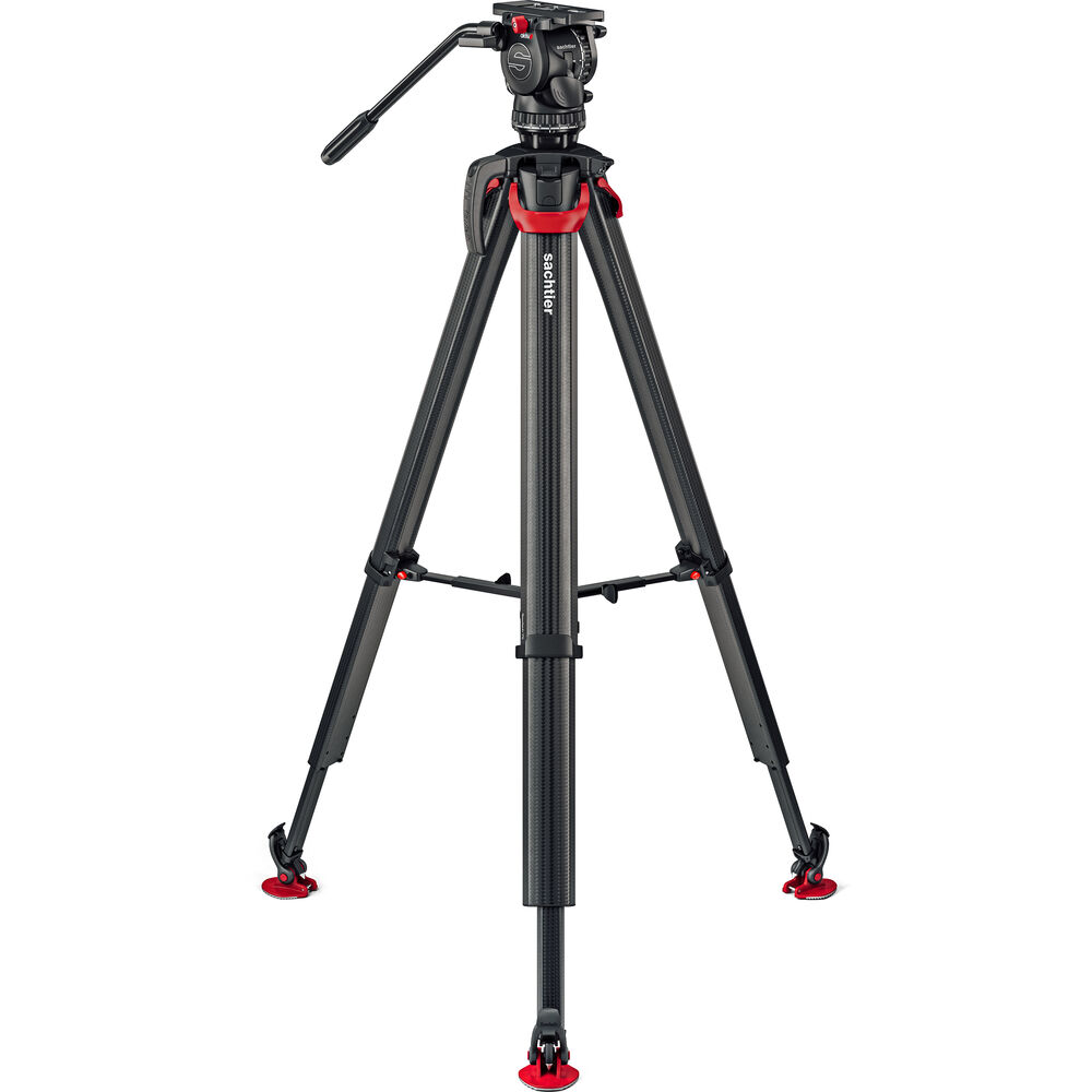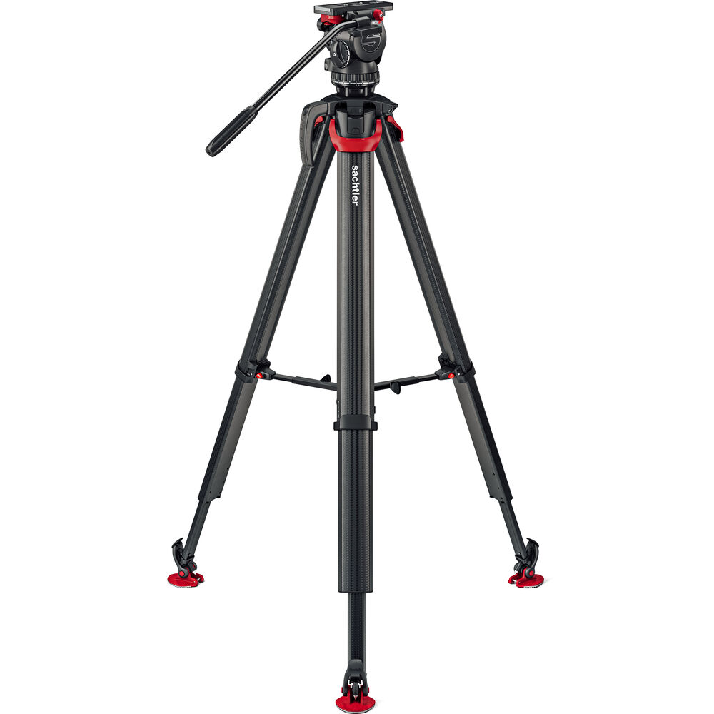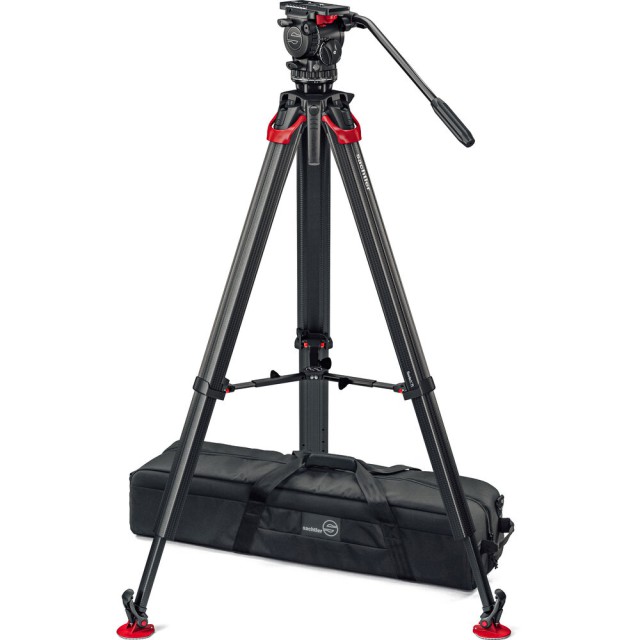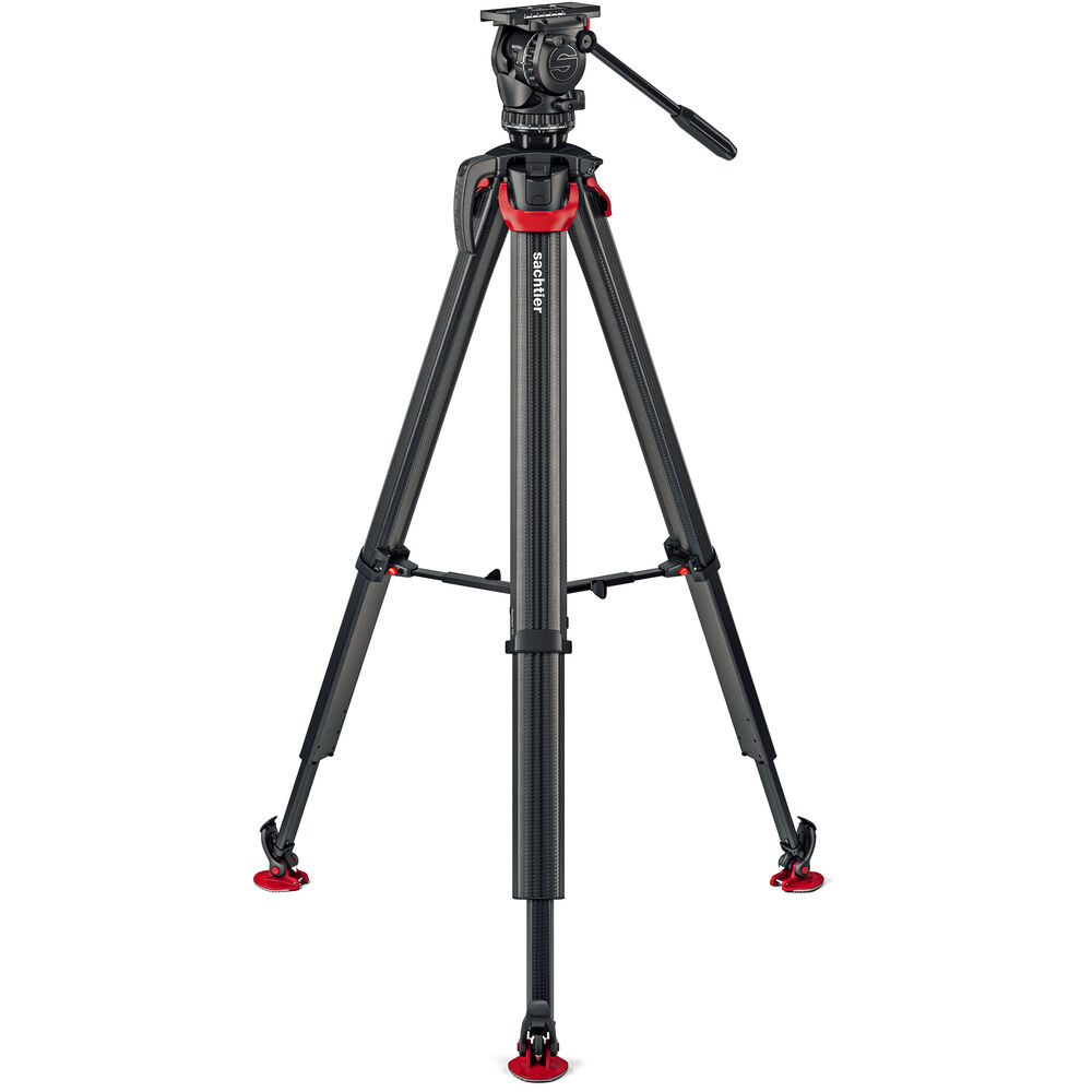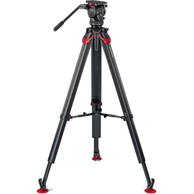 El trípode Sachtler Flowtech 75 MS de fibra de carbono, con un separador de altura media y patas de goma, se aleja del diseño habitual con tubo simple o doble de fibra de carbono y, en su lugar, ha rediseñado la forma de las patas para aumentar la rigidez torsional. Las patas de trabajo pesan menos de 3 kilogramos, pero soportan una carga útil de hasta 20 kilogramos y, utilizando el separador central extraíble incluido, se extienden desde una altura mínima de 24" hasta una altura máxima de 61". Cada pata está equipada con una única palanca de sujeción que bloquea y desbloquea las secciones.