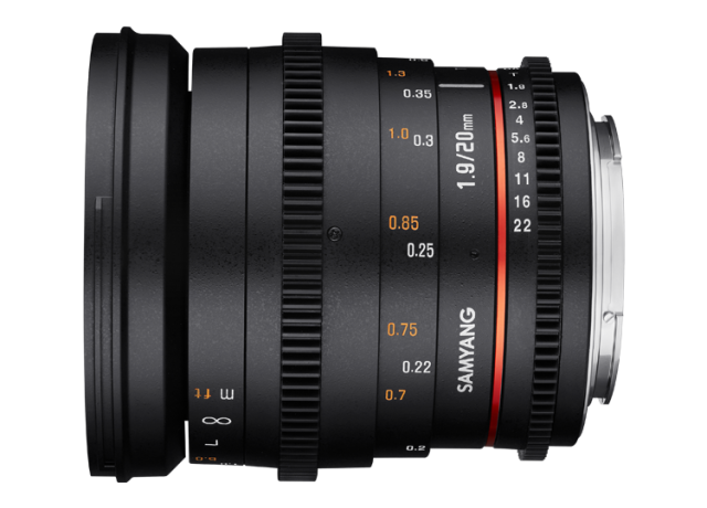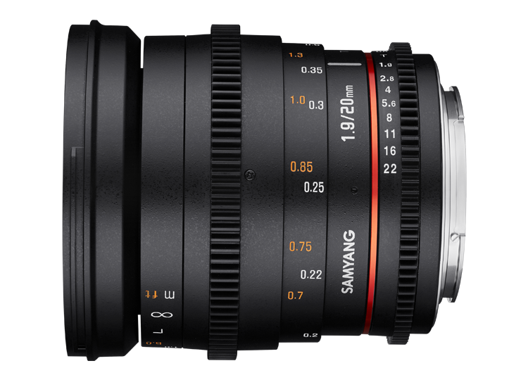 El objetivo Samyang 20 mm T1,9 ED AS UMC es, concretamente, un objetivo de cine diseñado de forma óptima para sistemas profesionales de enfoque automático gracias a su enfoque silencioso y fluido y al anillo de diafragma liberable. Además, en ambos lados del objetivo se indican la escala de distancia y los valores T, lo que facilita la fotografía.