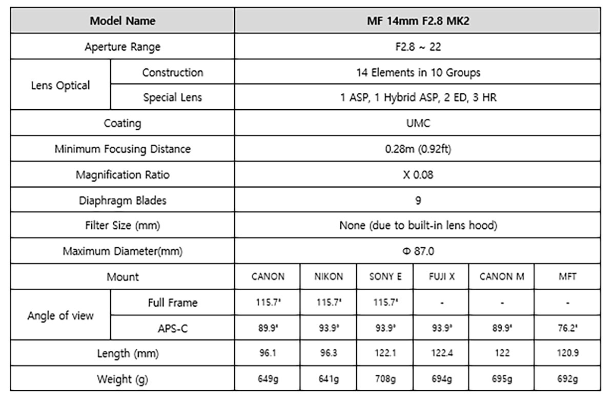 El modelo MF 14 mm F2.8 MK2 está compuesto por 14 lentes en 10 grupos, incluyendo tres de alto índice de refracción (HR), una asférica (ASP), una híbrida asférica (H-ASP) y dos de tipo ED. El diseño óptico del objetivo, junto con el revestimiento protector Ultra Multi Coating (UMC) del elemento frontal, garantiza una imagen nítida con un mínimo de aberraciones cromáticas, una distancia mínima de enfoque de 0,28 m y un ángulo de campo de 115,7˚.